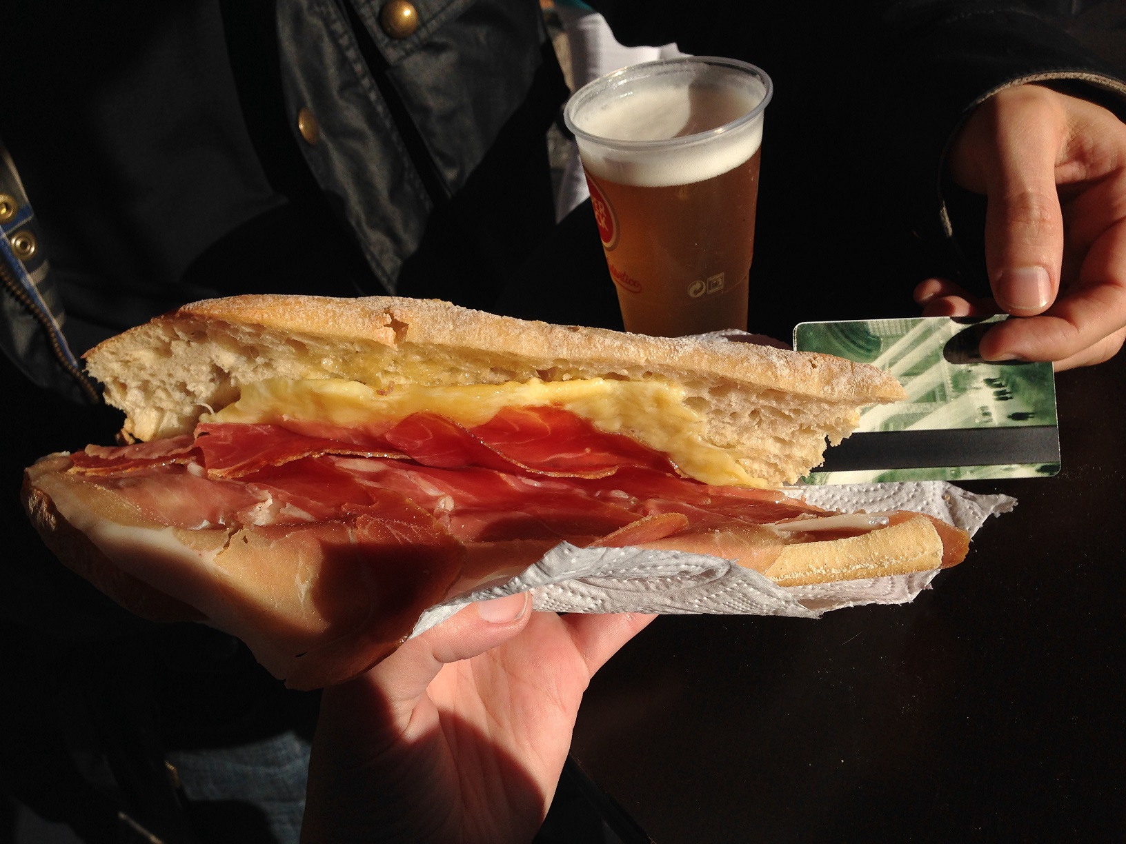 For €6, I was able to get a massive sandwich with cured ham (presunto) and raclette cheese on perfect bread. Portuguese bakers sure know how to make bread. While the guy got a little impatient with the raclette, and the cheese didn’t quite spread properly, I loved every bite. Even with the exchange rate not in our favor, the metrocard as scale should indicate that this was a generously sized sandwich. I also loved the option of a small Super Bock for just €2. It was a perfectly sized beer for lunchtime.