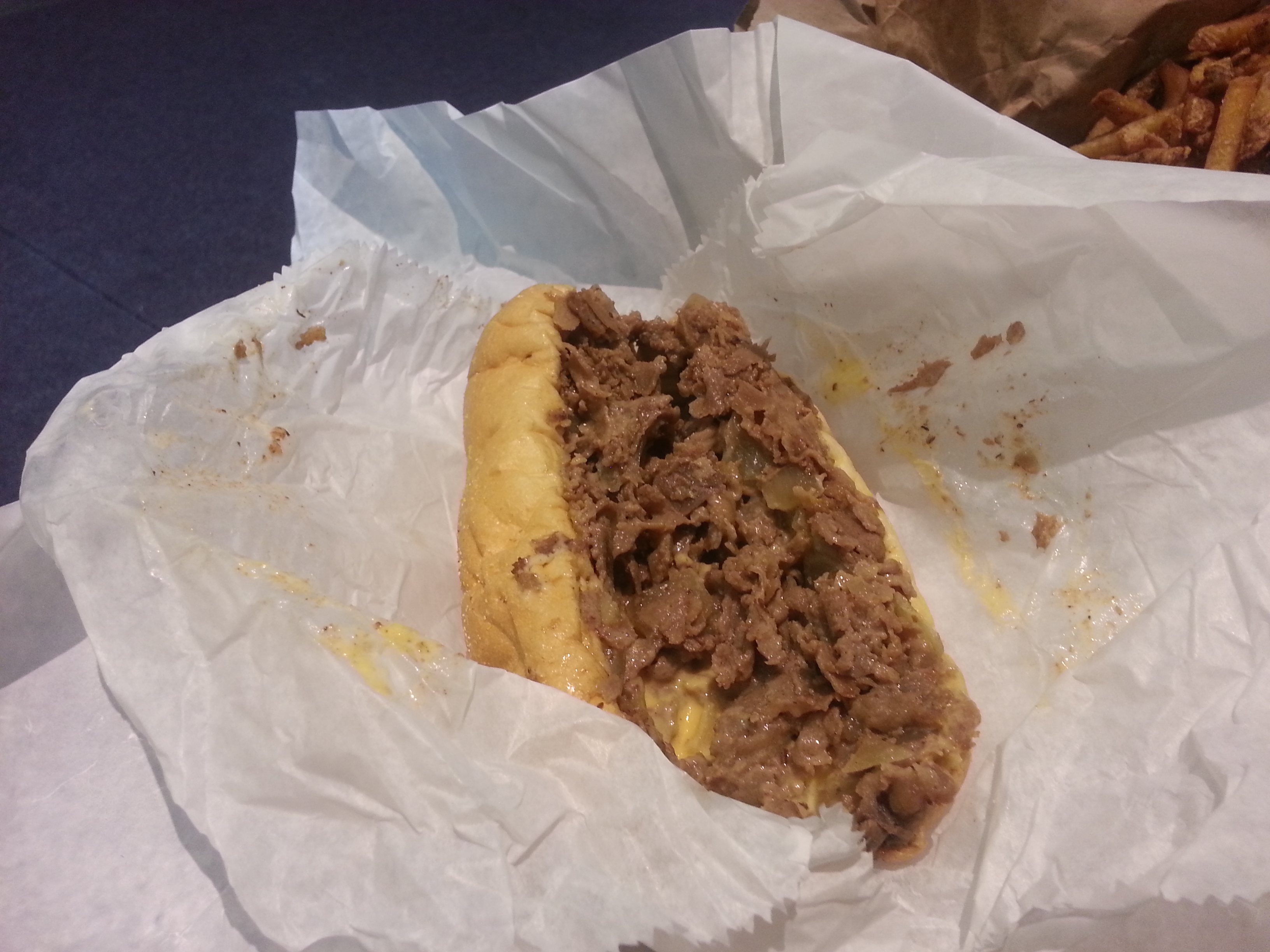 And because why not, I ordered Whiz fries as well ($5). For some reason, I thought these were going to be ‘cheesesteak fries’ – ie, topped with whiz and maybe some onions – so I was a little confused when they came as above. A really hefty portion of fries that were nice and crisp, and held up well to me walking two avenues, I thoroughly enjoyed the fries. The Whiz in the little cup, however, hadn’t been heated and was just a congealed blobby mess, reminding me that I shouldn’t be eating whiz in the first place because that’s what it does to your arteries. No one wants to reminded of that! I’ll skip the Whiz next time and just get fries for $4.