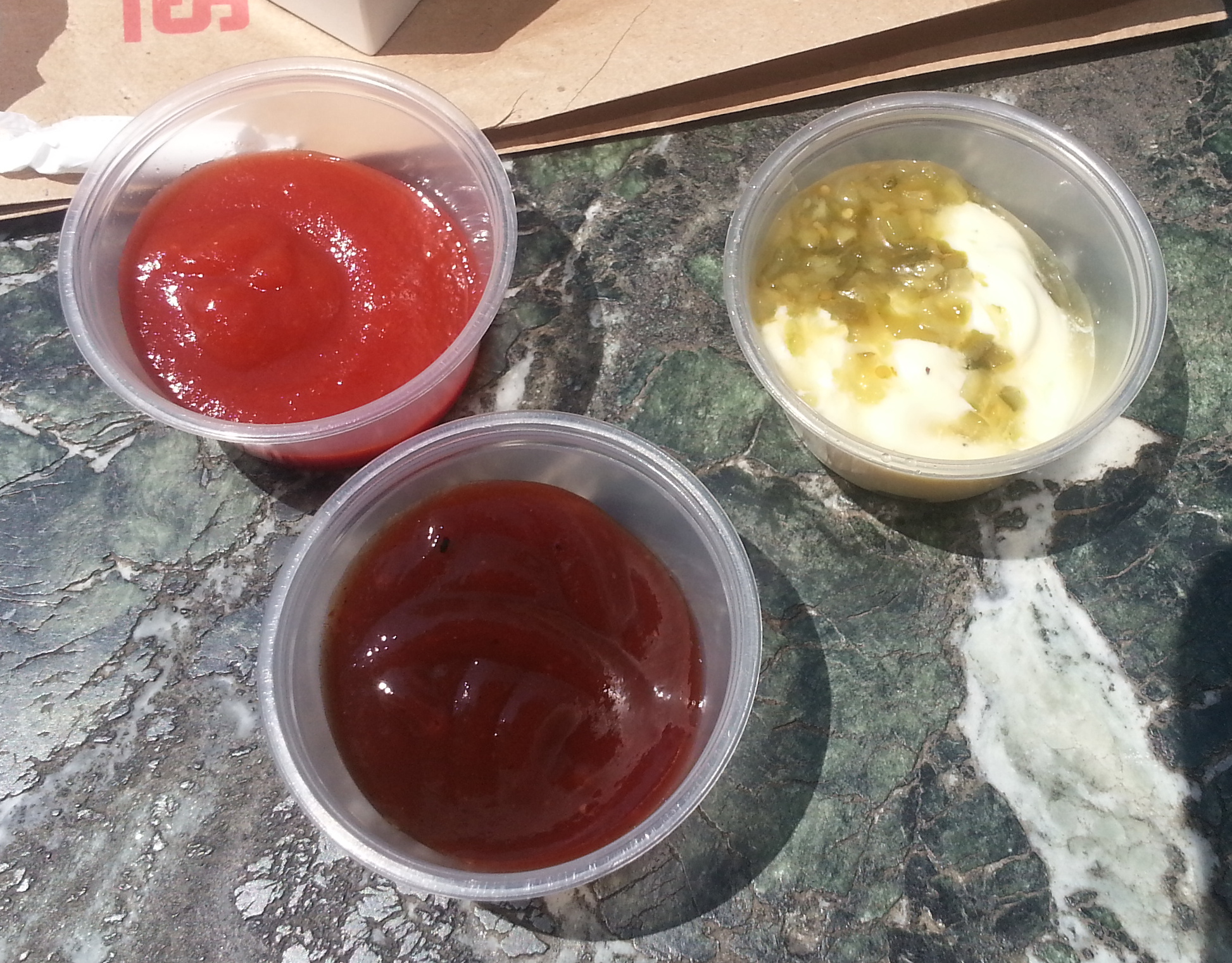 … especially with some of the awesome sauces they had on the side! There was an entire row of pump-your-own sauces, like regular ketchup, mayonnaise, mustard, … but what caught my attention was the tomatillo relish (which I mixed with mayonnaise), root beer BBQ sauce, and Sir Kensington’s spiced ketchup. The BBQ sauce was fairly sweet from the root beer (I think it was A&W), and while I wished the tomatillo relish had a little more kick, it was actually really good on my fries. The spiced ketchup – which I’ve had before – well, it was a nice touch to have it offered, and it’s good… just couldn’t hold a candle to the tomatillo relish/mayo combo, for my palate.
