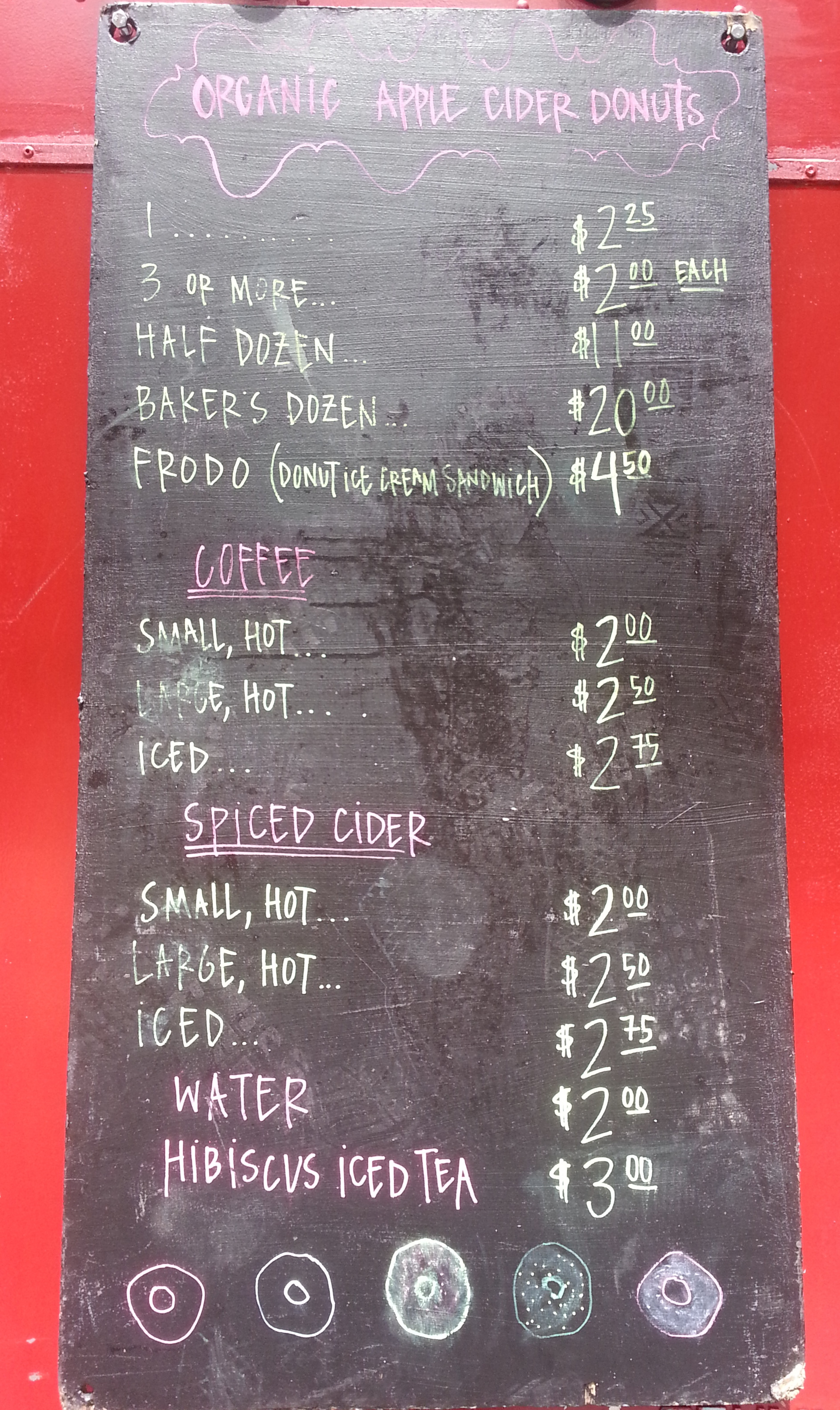 They only offer one donut style and flavor, organic apple cider donuts. I was a bit appalled at the prices – $2.25 for one?! – since I’m used to the small ones they sell at the apple picking places or farmer’s markets. But I sucked it up for ML readers and ordered one… because I failed to notice their “FRODO” until after I’d already ordered, plus I didn’t really feel like ice cream. They also offer volume discounts – the more donuts you buy, the cheaper they are, with the cheapest being a baker’s dozen, 13 donuts for $20, working out to a little more than $1.50 a donut. (Unless they don’t know what a baker’s dozen is, which is entirely possible as I’ve seen some places say that but then not realize it’s actually 13. I thought this was common knowledge, but…) Coffee and spiced cider – both in hot or iced varieties – round out the menu, along with water and hibiscus iced tea.