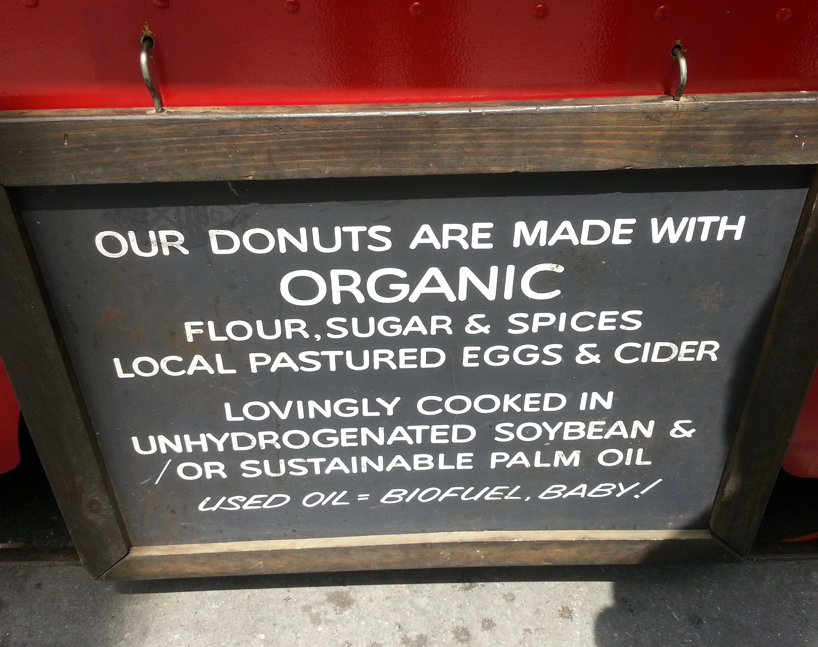 After I’d ordered, I noticed this sign below the window. The donuts are made with organic flour, sugar, spices, and local pastured eggs and cider, then “lovingly cooked” in unhydrogenated soybean and/or sustainable palm oil. The used oil is then used as biofuel. All things to justify the high cost of a single apple cider donut, I suppose, but if these aren’t things that you also find important, you may not feel it warrants that price tag.