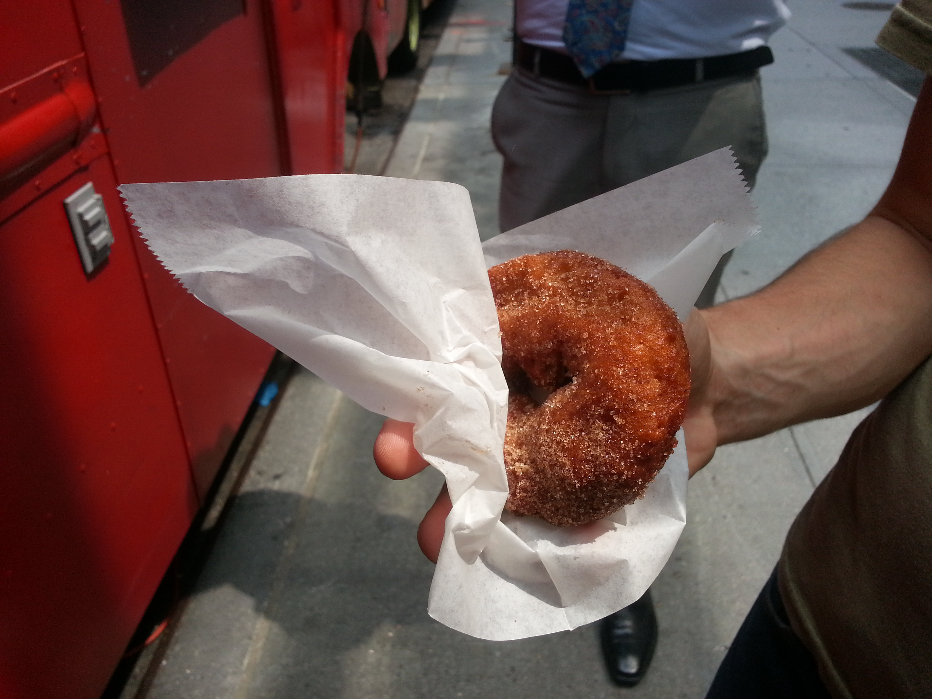 And here’s the donut, which came warm to hot – but not piping hot, to my happiness, as I have this awful habit of trying to eat things while they are still way too hot to consume and burning the hell out of my mouth – and was bigger than I’d expected, closer to the size of a regular donut, and was actually really, really good. The granulated sugar on the outside was a nice crunchy counterpoint to the soft innards, and there was a good crust on the outside of the donut. I really enjoyed my donut, and thought it was a nice little snack.