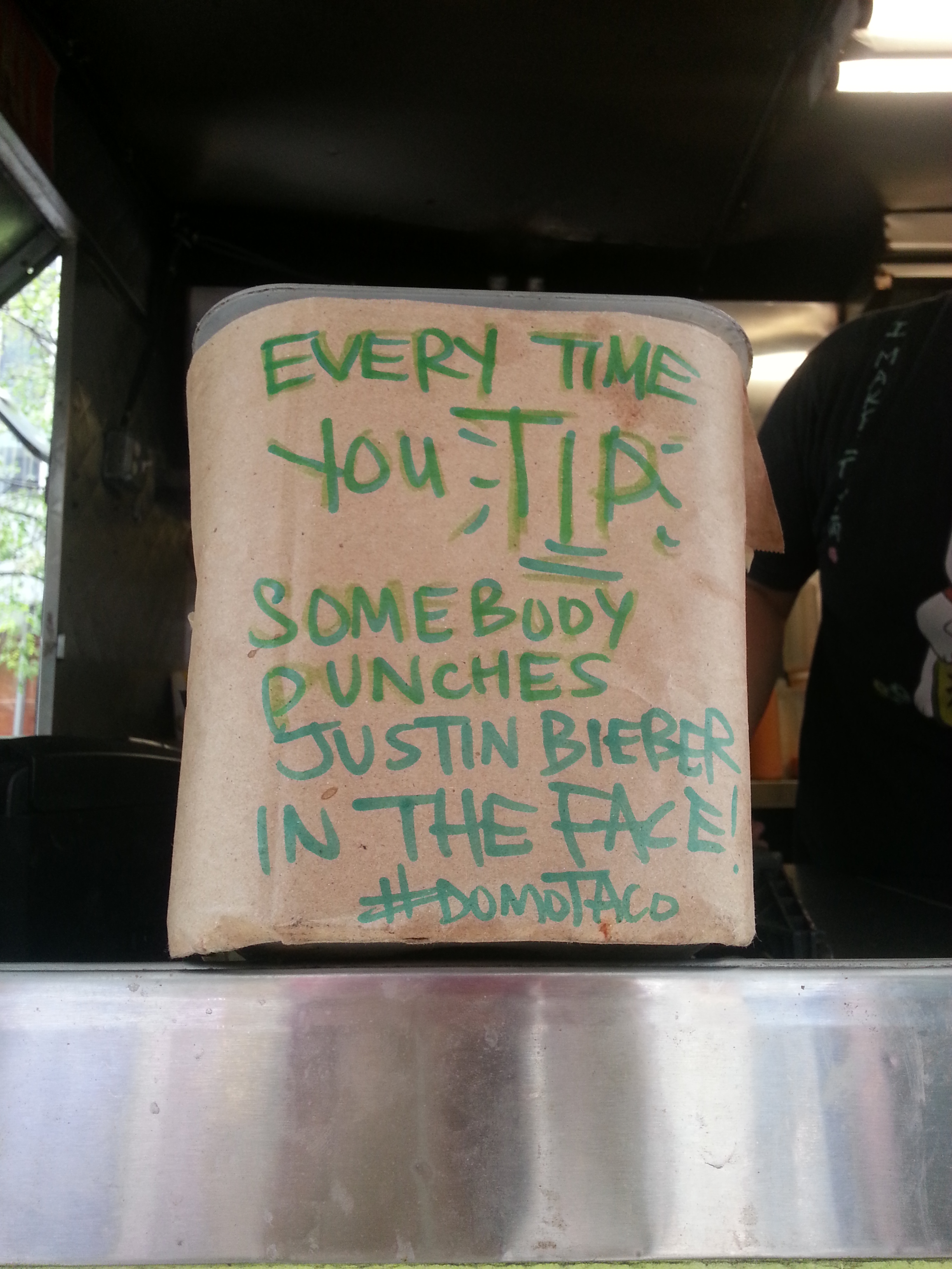 The sign on their tip jar alone should make you want to visit: every time you tip, someone punches Justin Bieber in the face. When I dropped my tip in, I asked the guy for video, and he said that… oh, who was it? Some celebrity already punched Bieber in the face. What! Must Google.