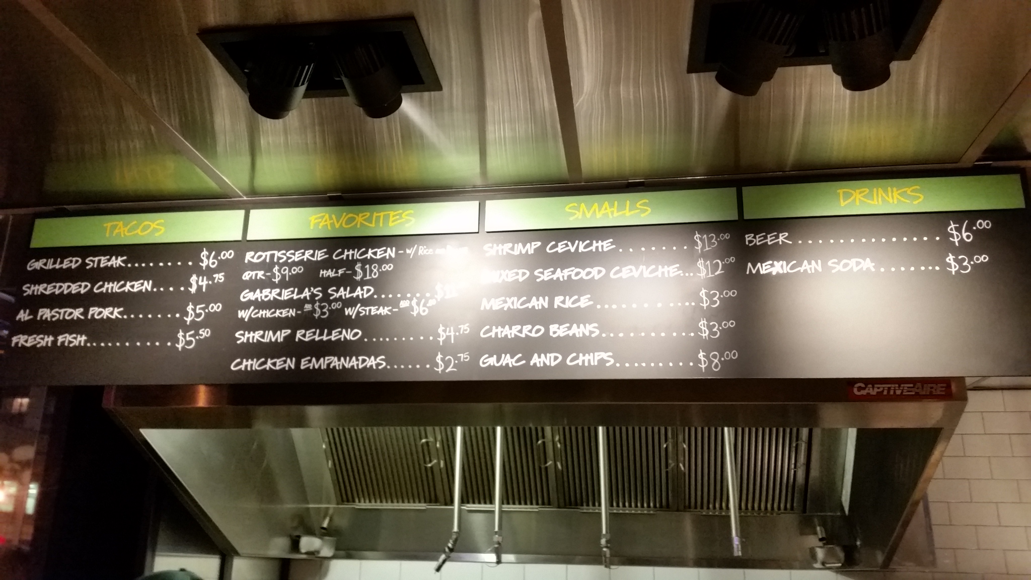 Gabriela’s Taqueria (click twice to get the menu to show larger) – for some reason, also offers rotisserie chicken in addition to their tacos. The price is obscured by spotlight; $9 for a quarter chicken, $18 for a half. Comes with rice and beans. Gabriela’s salad (it does not say what’s in it) is $11, add chicken for $3 and add steak for $6. I think the other prices are visible in the photo.