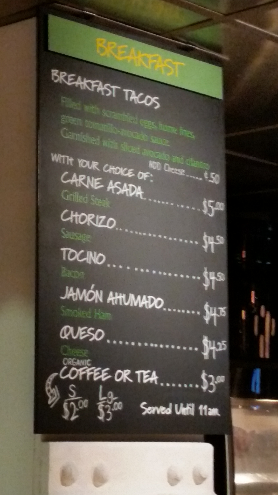 More importantly they have breakfast tacos! Which are served until 11am, though I was informed the entire hall opens at 11. Maybe they open earlier? Not sure.
