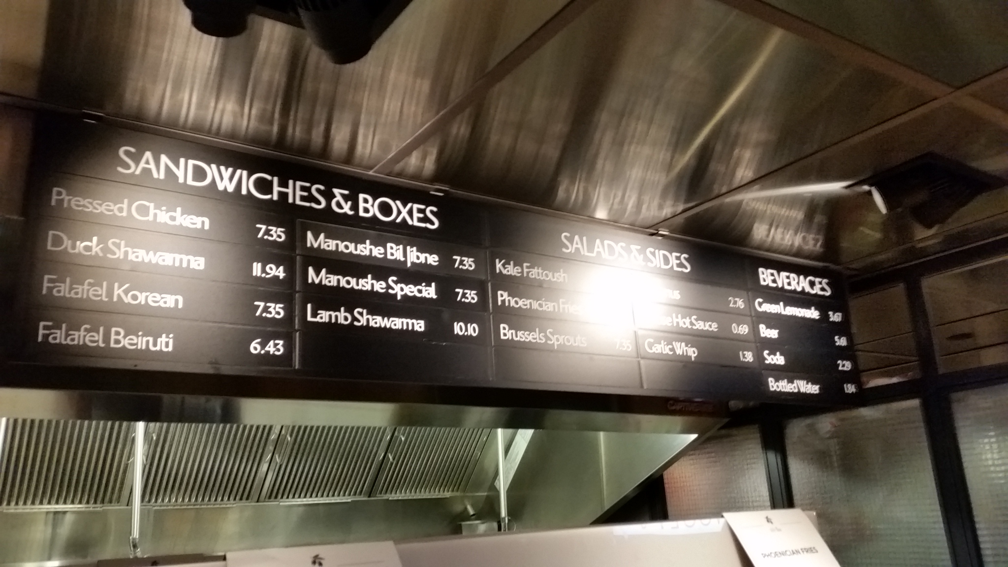 ilili box, the casual offshoot of personal favorite ilili, has interesting Lebanese accented items like duck shwarma (the only item well over $10). Prices were once again obscured by glaring lights: kale fattoush 8.27; Phoenician fries 2.98; Brussels sprouts 7.35; Hommus 2.76; House hot sauce 0.69; Garlic whip 1.38.
