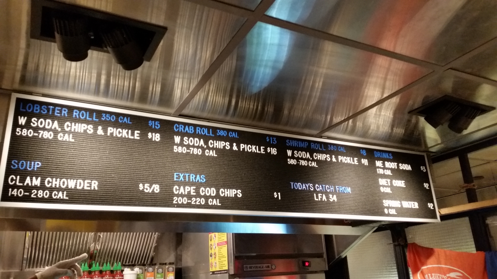 Finally, Luke’s Lobster, which, as expected, has only one item under $10 – the shrimp roll alone, for $8. Is this new – the calorie counts are posted. Do they have that many locations now (I forget the minimum number of locations before law requires you post calorie counts)?