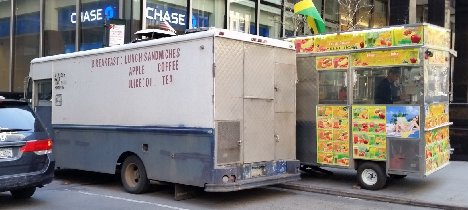 Strangely, a week after I noticed it on the corner of 48th and Park Ave, this happened – a fruit cart started parking right in front of it, blocking part of it. Maybe the cart was on vacation the week I noticed the Jerk Pan truck and just came back? I just thought that was weird.