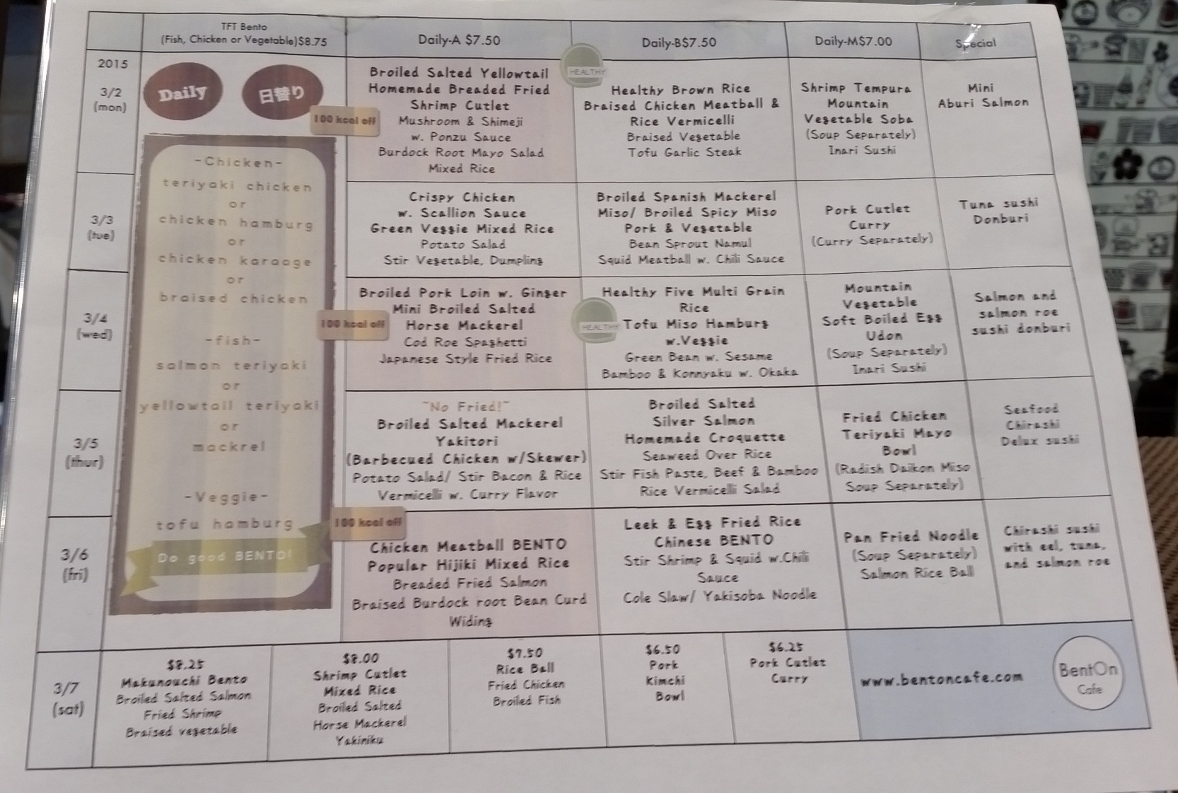 Plenty of signs all around – both outside the store and inside – tell you what you can expect each day of the week. One of ML’s readers alerted me to the amazing Friday chirashi special ($8.75) but warned that if I didn’t get there early, it would sell out. She was right – I got there at about 1:10pm and it was long gone, an empty space where the stacks of bowl probably were. Instead, I grabbed one of the pre-made bento off to one side when the cashier informed me there was also no curry udon to be had. Boo… but she indulged me as I questioned what each item inside the bento was.