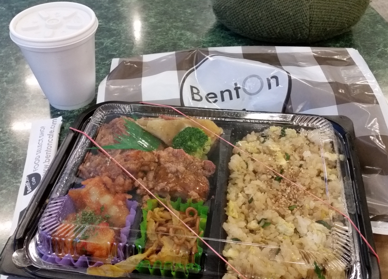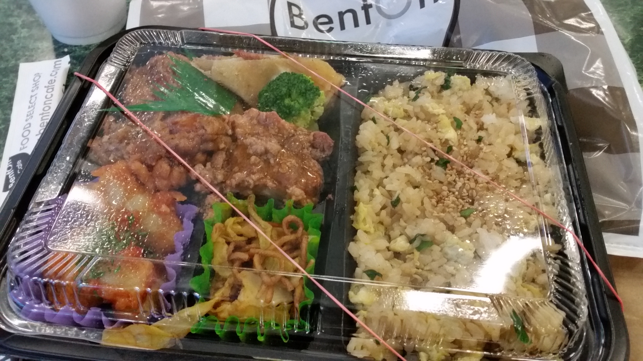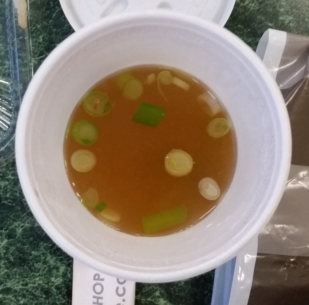 Perfectly serviceable miso soup inside the cup – not piping hot, but still hot by the time I walked the 10 minutes back to an atrium near my office. A couple of cubes of tofu in the bottom, and I was happy on the chilly (when I went) day.