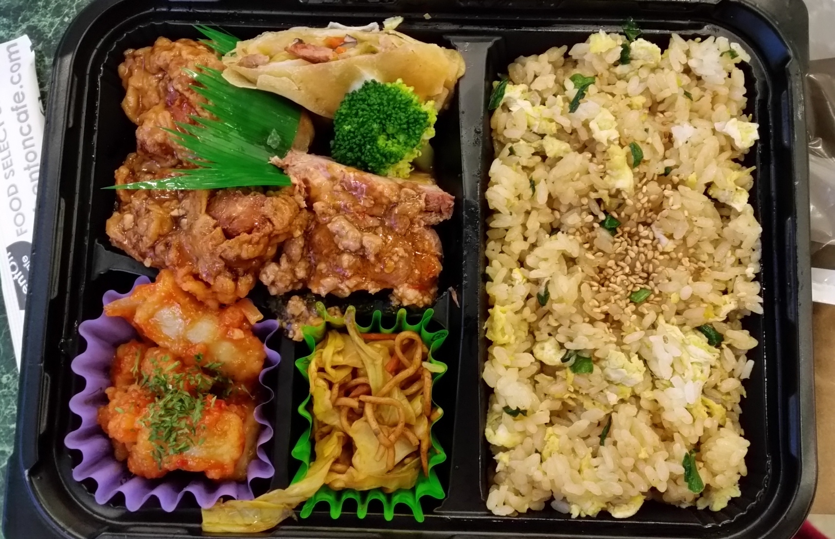 For $8.17, this is a pretty big bento with a wide variety of items scattered inside. Sure, the largest compartment – about 1/3 of the container – contains a fairly bland/mild ‘fried’ rice of sorts, but it serves as a great foil to the rest of the goodies.