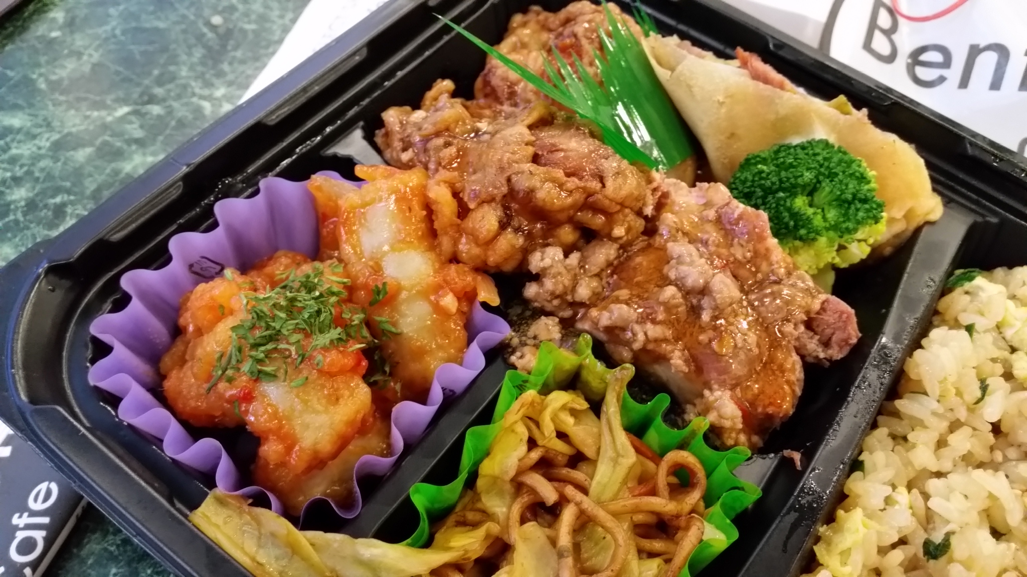 No, the stars were definitely this little cup of squid and the pork/chicken pieces in the back. If you have food allergies – especially seafood – I would double check what you’re getting before you pick one of these up, because I honestly thought those were potato chunks when I picked this up at first. The girl working the register said it was squid, and yes it was – chewy pieces of squid coated in an ever so slightly spicy sauce that was really nice against the rest of the slightly sweet, almost gloppy sauces. The little green cup with a small bit of noodles and cooked cabbage was fairly bland, too, but then the fried chicken and pork pieces were drizzled with a sweet soy-type sauce, meaty and delicious. Be aware that you can pick through the various bento – I chose one with bigger pieces of pork and chicken, though there were certainly others available with less meat if that’s your thing.