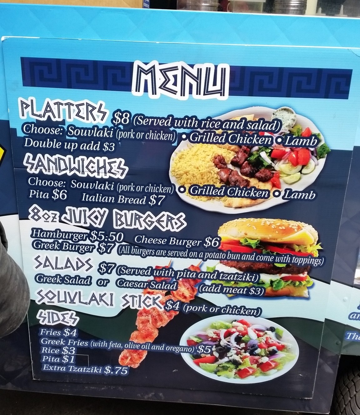 I did find out, however, that they just finished their third week in that spot, and they intend to always be in that spot. They have no affiliation to Uncle Gussy’s – though they certainly know who Uncle Gussy’s is – and simply picked the blue because “that’s the blue of Greece, you know, our flag and everything.” Ah. The guy seemed very confident and happy, assuring me that I’d like the food.