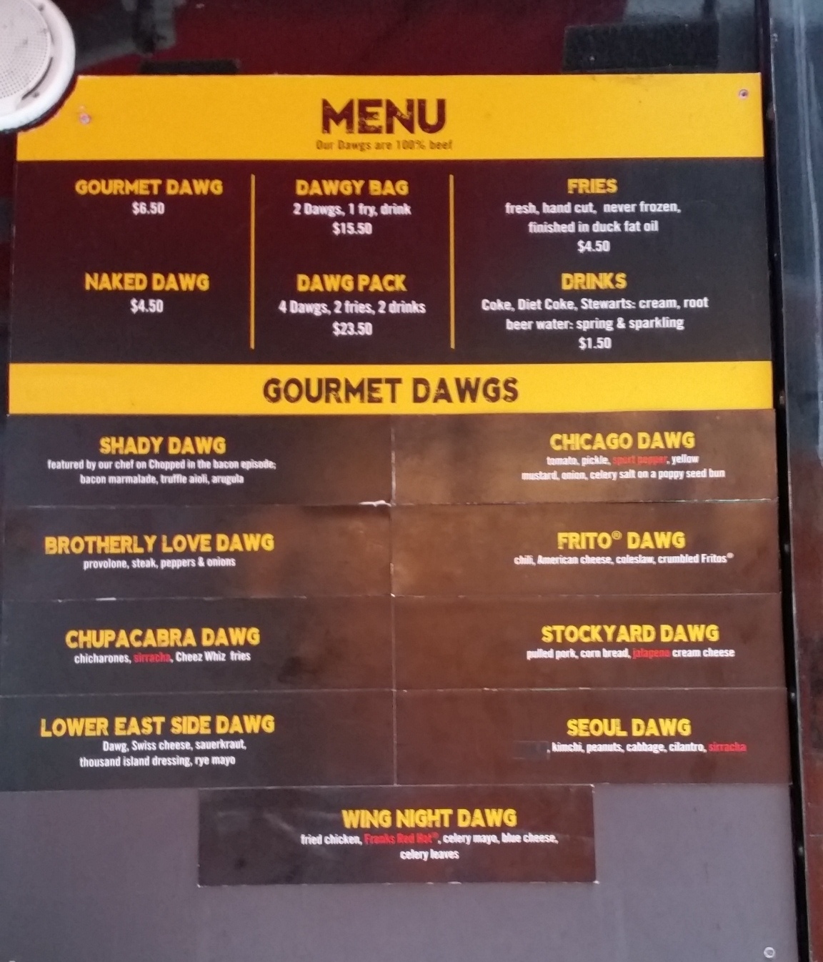 • Hard to see in the blurry menu photo but they cook their fries in duck fat.