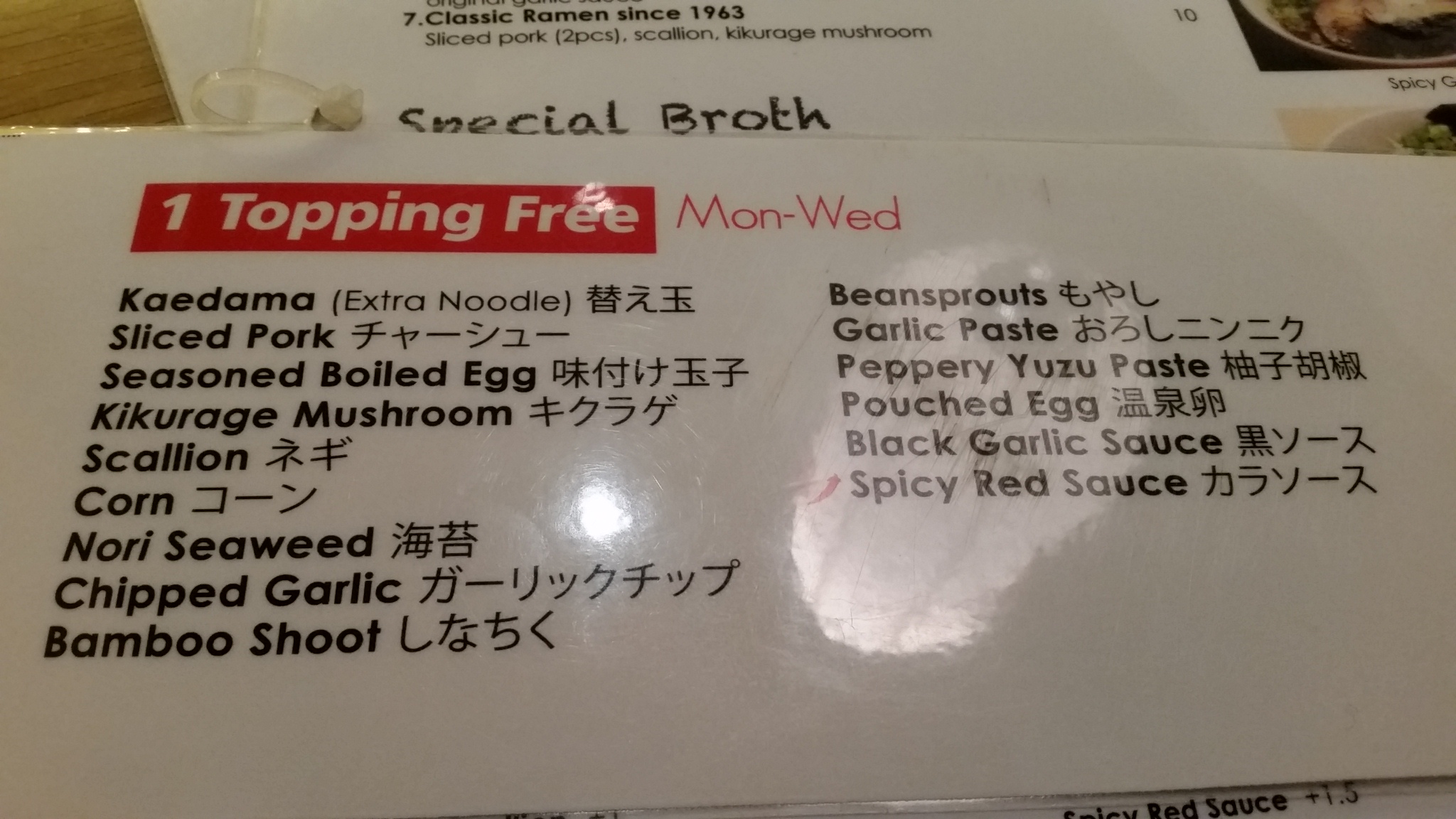 It was Wednesday, and Monday – Wednesdays for lunch you get a free topping. Ah. While it doesn’t include ALL of their toppings (avocado isn’t on there; though I wouldn’t think to put this on my ramen, as I was paying I heard someone order it though he also sounded like he’d never had ramen at a restaurant), there’s certainly a wide range of choices to help make your $10 classic ramen even more delicious.