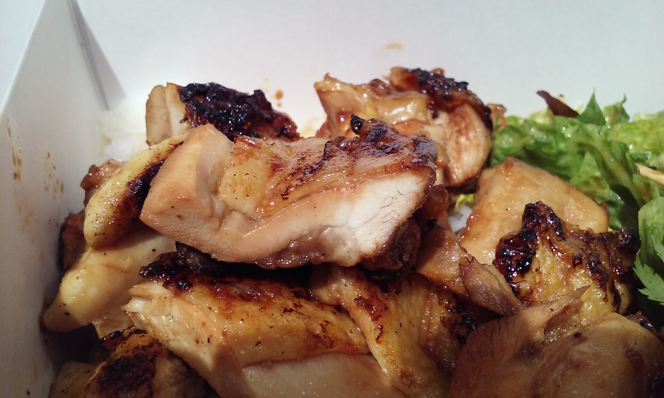 The chicken is grilled, and has a good, smokey flavor. If I had one complaint, it’s that the skin, which is left on, is not quite rendered down enough, so it’s a bit fatty and rubbery. Still, that’s a minor complaint. They go light on the sauce here, which is nice. You mostly taste the chicken, with just a hint of teriyaki sweetness. What sauce there is soaks nicely into the rice, which is sticky enough to handle with chopsticks, as it should be.