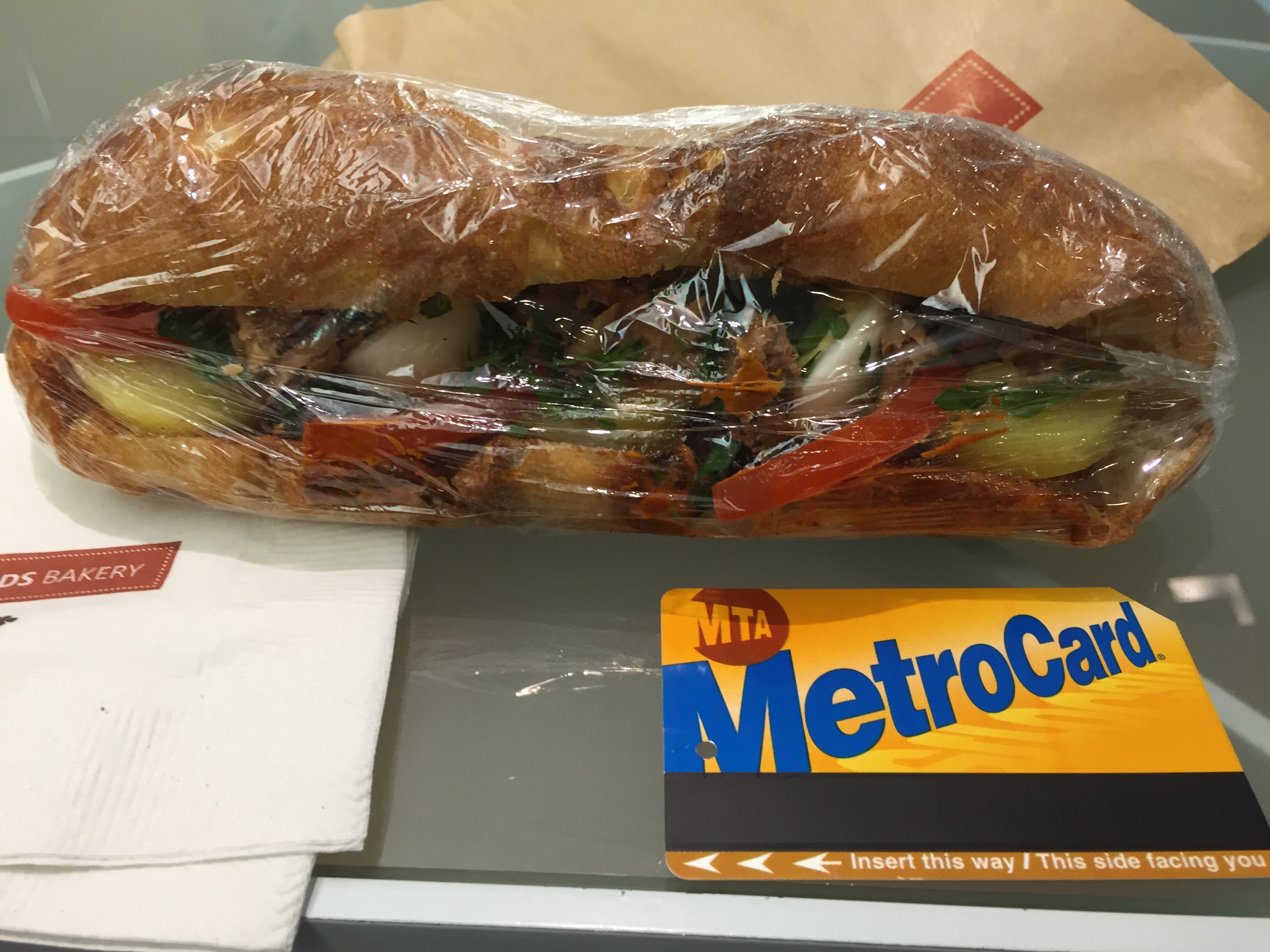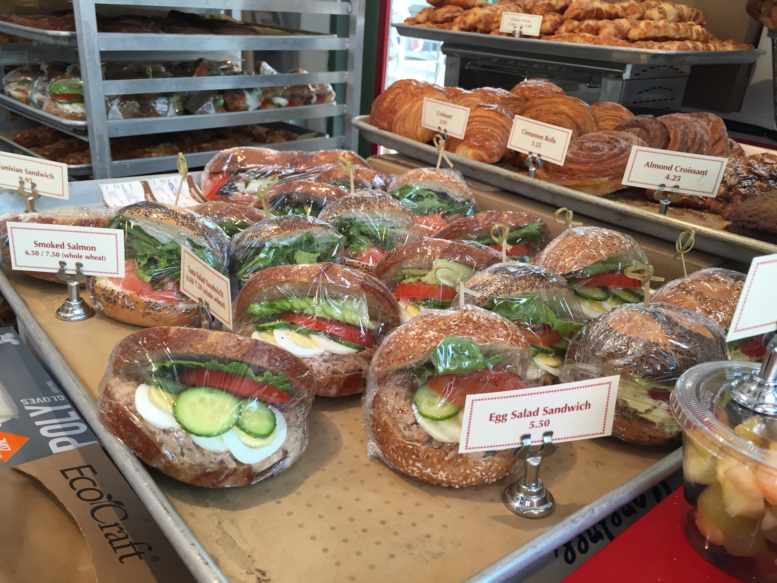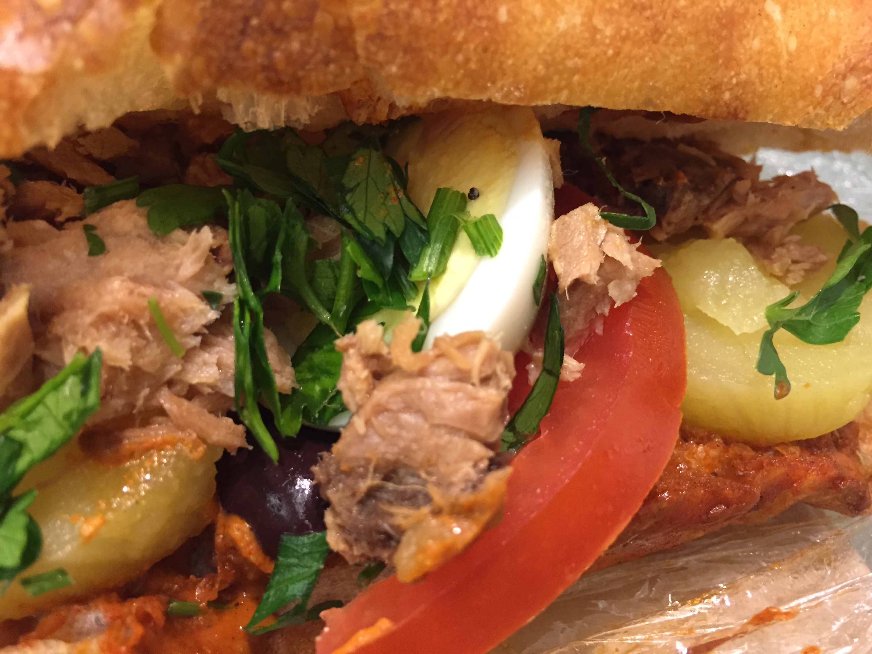 The round buns look a bit too small for a full meal, and not super exciting with the prevalent Egg Salad, Smoked Salmon/cream cheese, and Tuna Salad fillings, so I went with the only large sandwich on a long roll, the Tunisian. It’s also a tuna sandwich, but WAY more interesting with spicy harissa sauce, sliced potatoes, parsley, hard boiled eggs, olives, and tomato. It reminded me vaguely of a nicoise salad squished between some rustic bread.