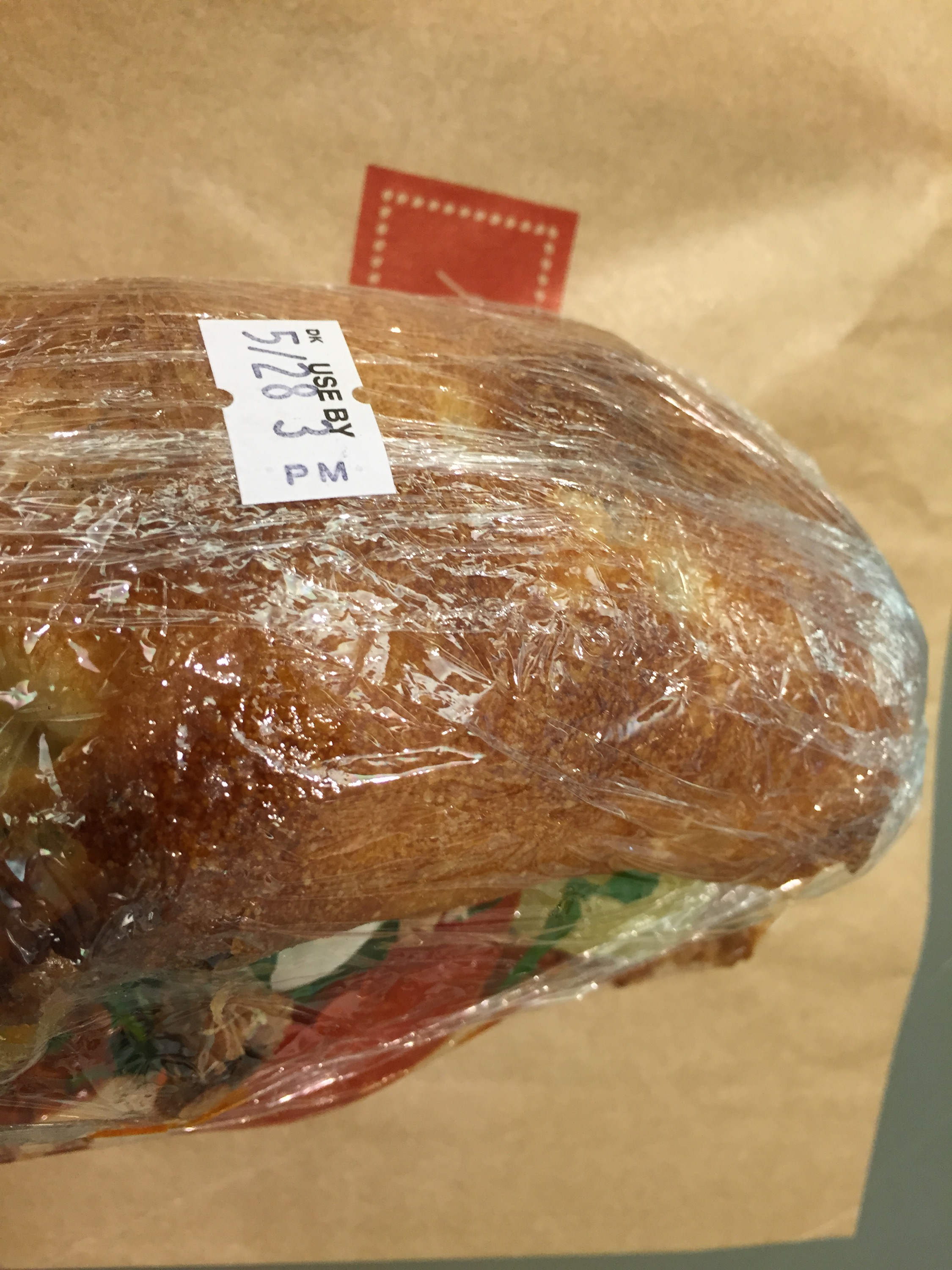 The price seemed a bit hefty at $9.95 for a pre-made sandwich swathed in cling wrap, stickered with a Use By date and time. However, the freshness could not be more evident. In fact, I had problems finishing the sandwich, so I had to revisit it a few hours after the Use By date. Let me just say, I like ladyfingers soaked in my tiramisu, but not harissa soaked in my bread.