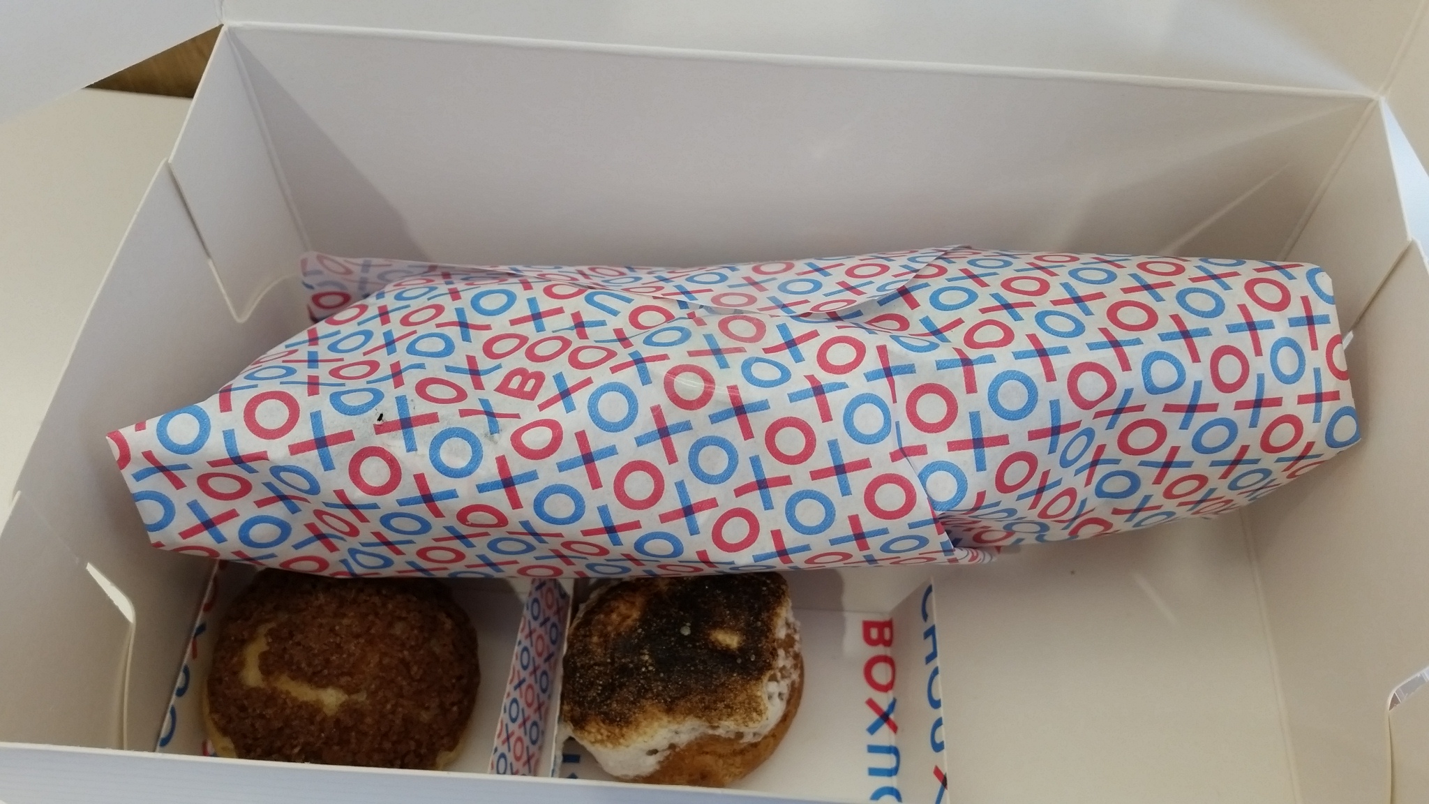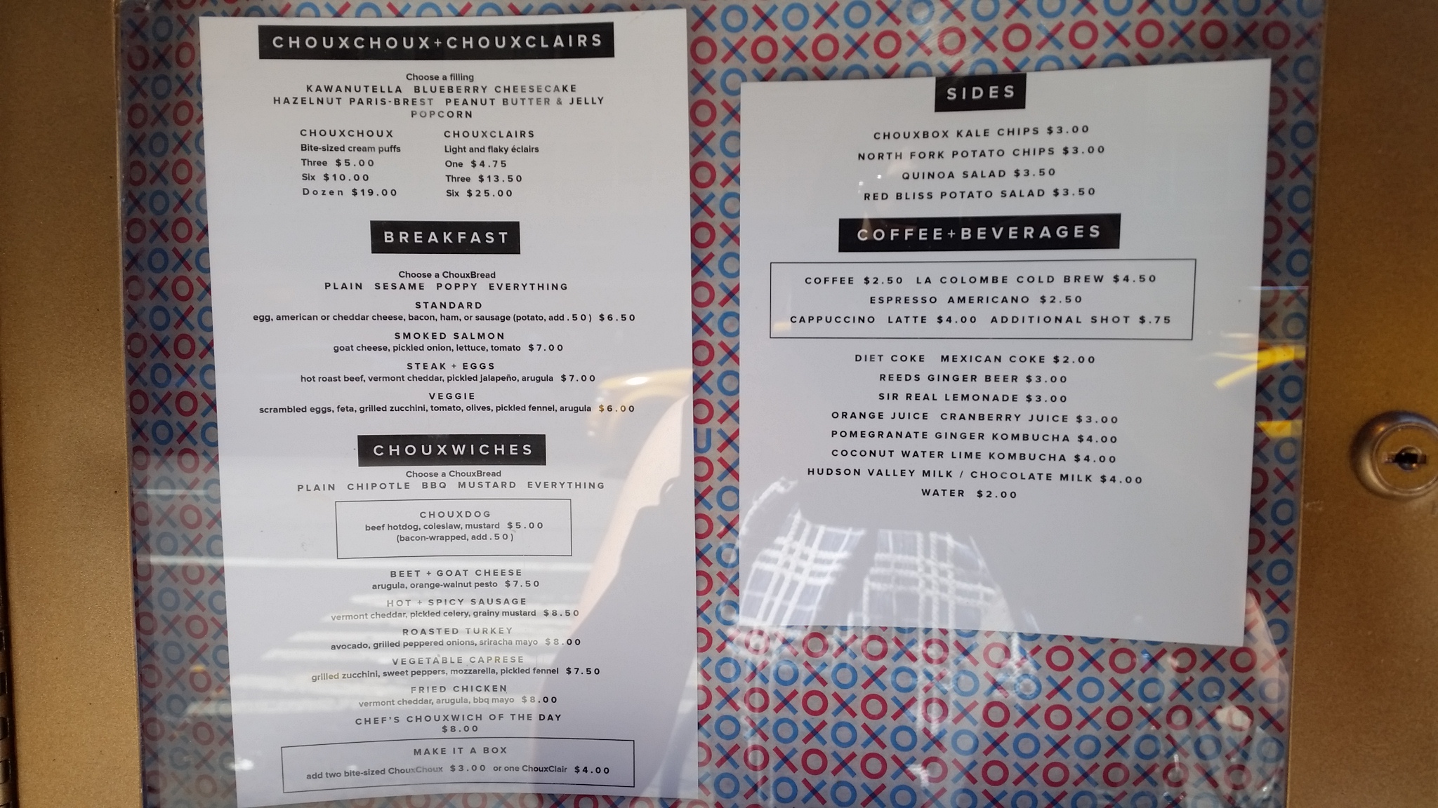 The entire menu is fairly flexible, allowing you to choose your flavor of ChouxBread – plain, chipotle, bbq, mustard, and everything – with your choice of innards. They have a breakfast menu, too, with other types of ChouxBread (sesame and poppy, in addition to plain and everything). They also offer a “make it a box” option – for $3 you can add two bite-sized ChouxChoux, or $4 for one ChouxClair (which normally costs you $4.75). I was confused how this worked with the sign outside, as I really am more of a savory person, but the cashier (at that moment, the owner’s wife, with whom I practiced a tiny bit of French – real French people, y’all!) informed me that all of the boxes come with potato salad.