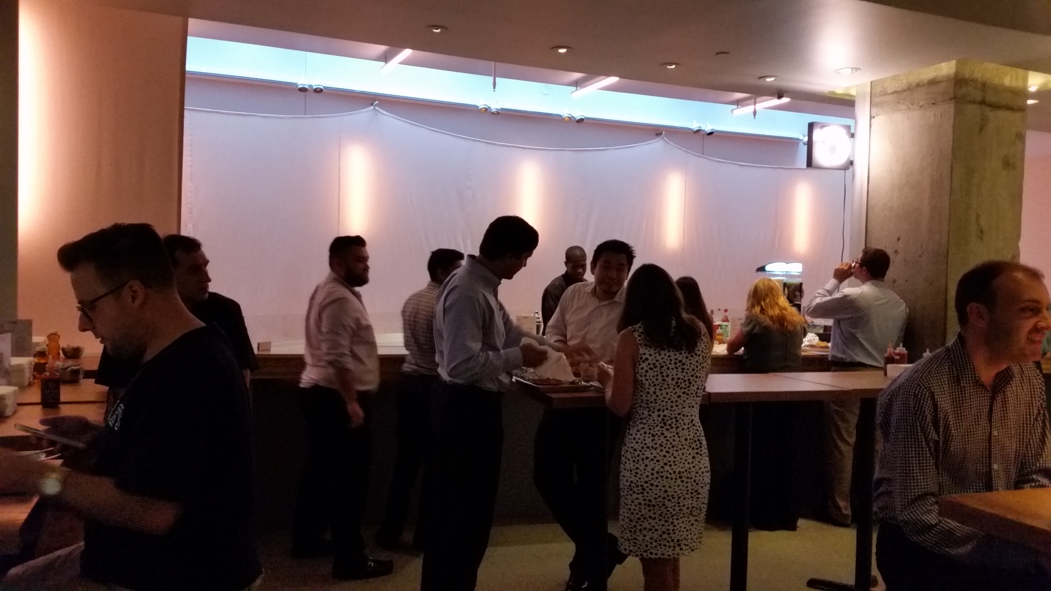 I went there at around 1:15. The line was just outside the door. It took around 30 mins to get in. There are almost no seats. Most people have to stand at a bar or table.