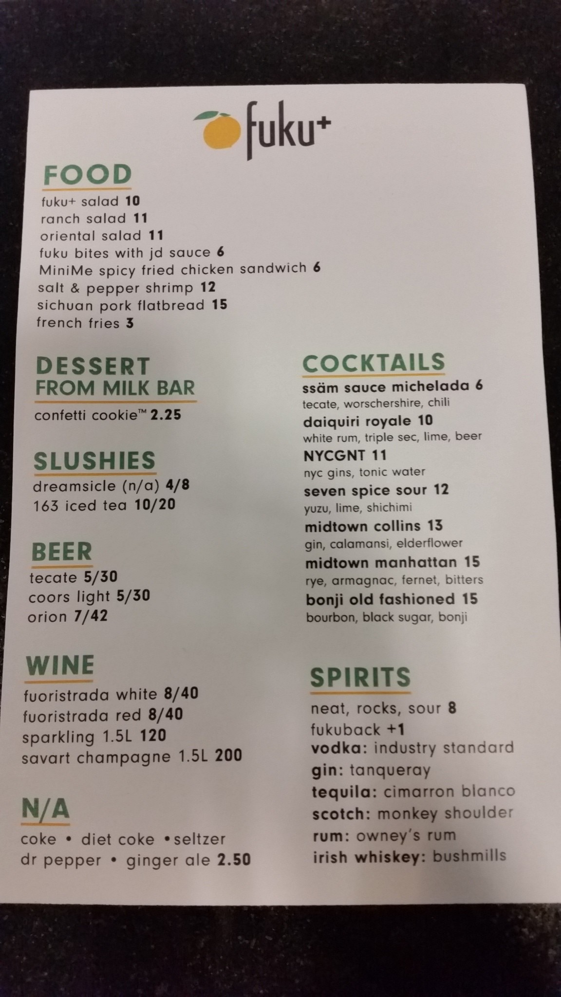 -the Fuku+ Salad sounds like the salad they serve downtown, minus the farro (Mandarin oranges, kale, etc.)
