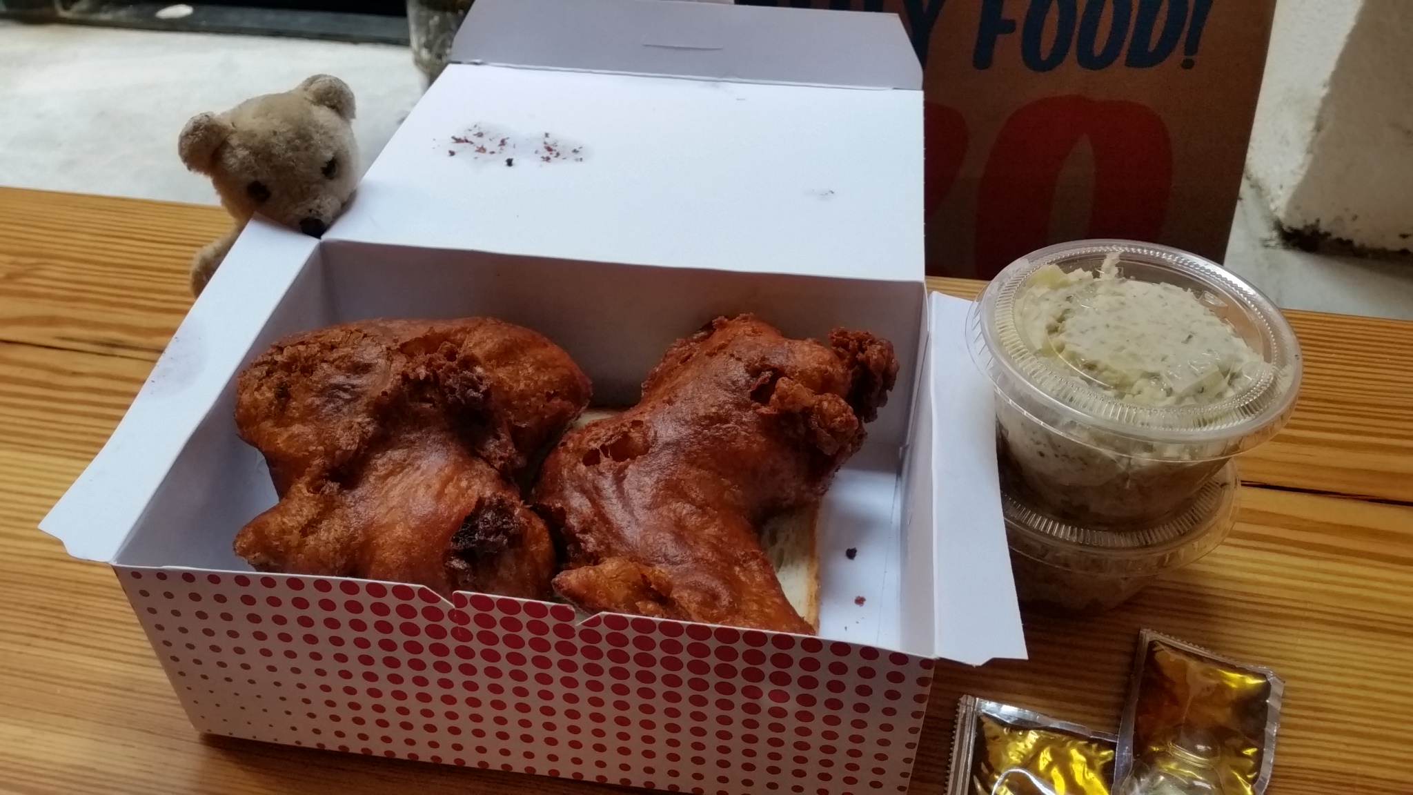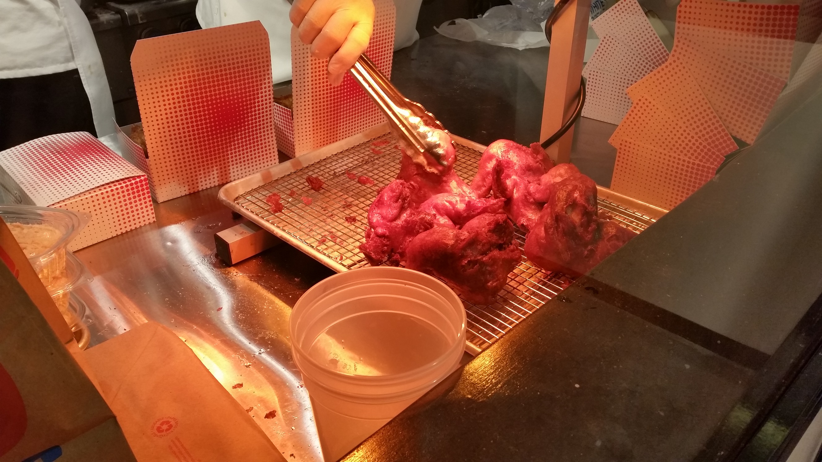 Monster chicken right out of the fryer. I asked the girl boxing orders if I could have all dark meat and she stared at me blankly before responding, “Um, well, they’re all wings.” Heh, yes, you read that right.