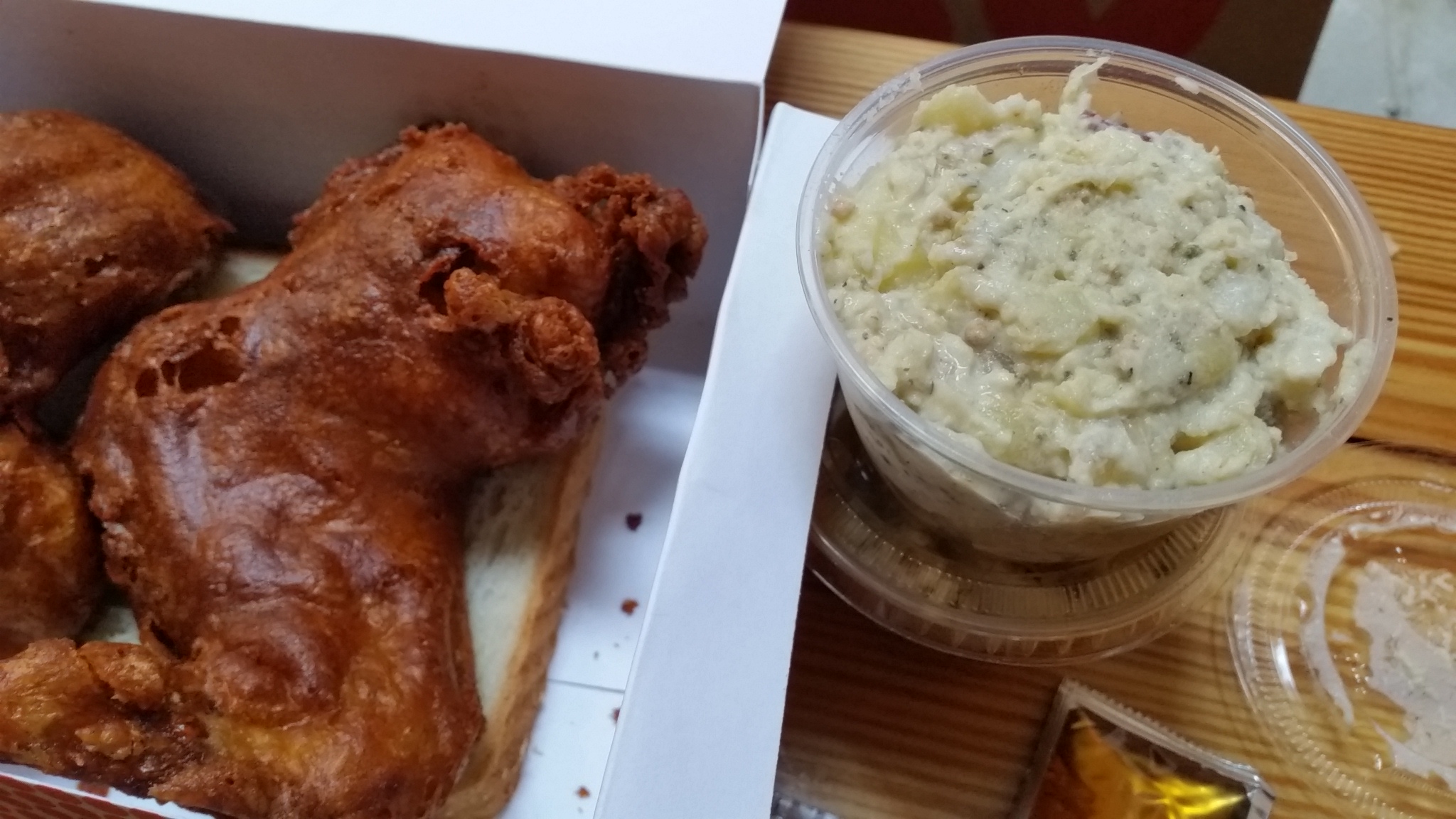 Also, this might be a bit nitpicky, but… those little packets of honey on the side are Kraft. If you’re going to charge this much for chicken and potato salad, upgrade the honey at least. I mean — the honey turned out to be way too floral to go with the chicken and really detracted from it. Or don’t give honey at all.