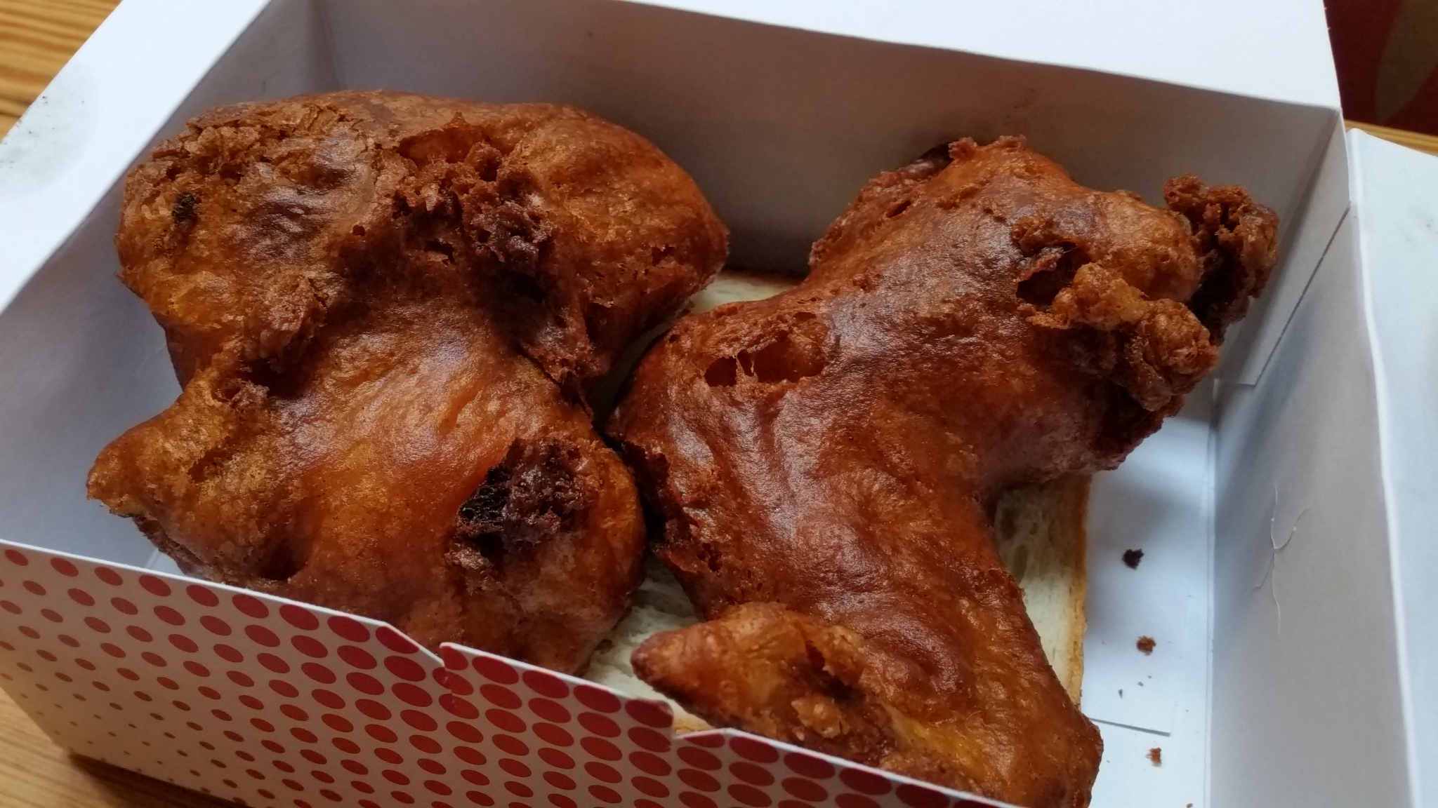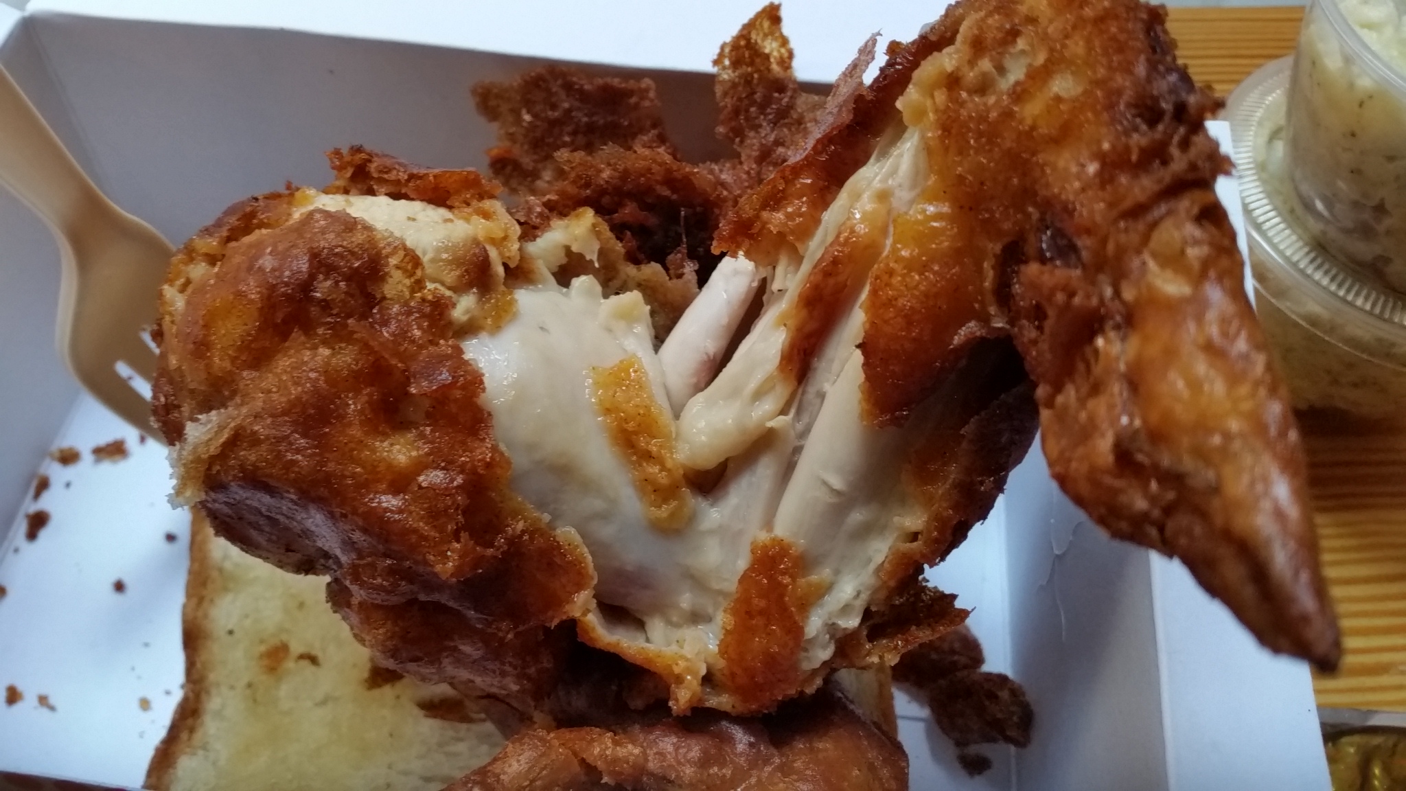 As for the chicken… sigh. Those are two wings under all that batter. Wings, including tip, wing, and drumette. Wings, battered and deep fried to golden crisp perfection. The batter mimics the best fried chicken in the country (the namesake passed away on Friday, actually) very closely, and I almost cried from just how close it gets to that amazing fried chicken with the thinnest crust, crackly, piping hot. Delaney Chicken’s batter is slightly spicy – but unevenly so, as my first few bites caused more than a few tears to trickle down my face, while the rest of the chicken wasn’t spicy at all and almost bland/unsalted (thus the use of honey for some zip).