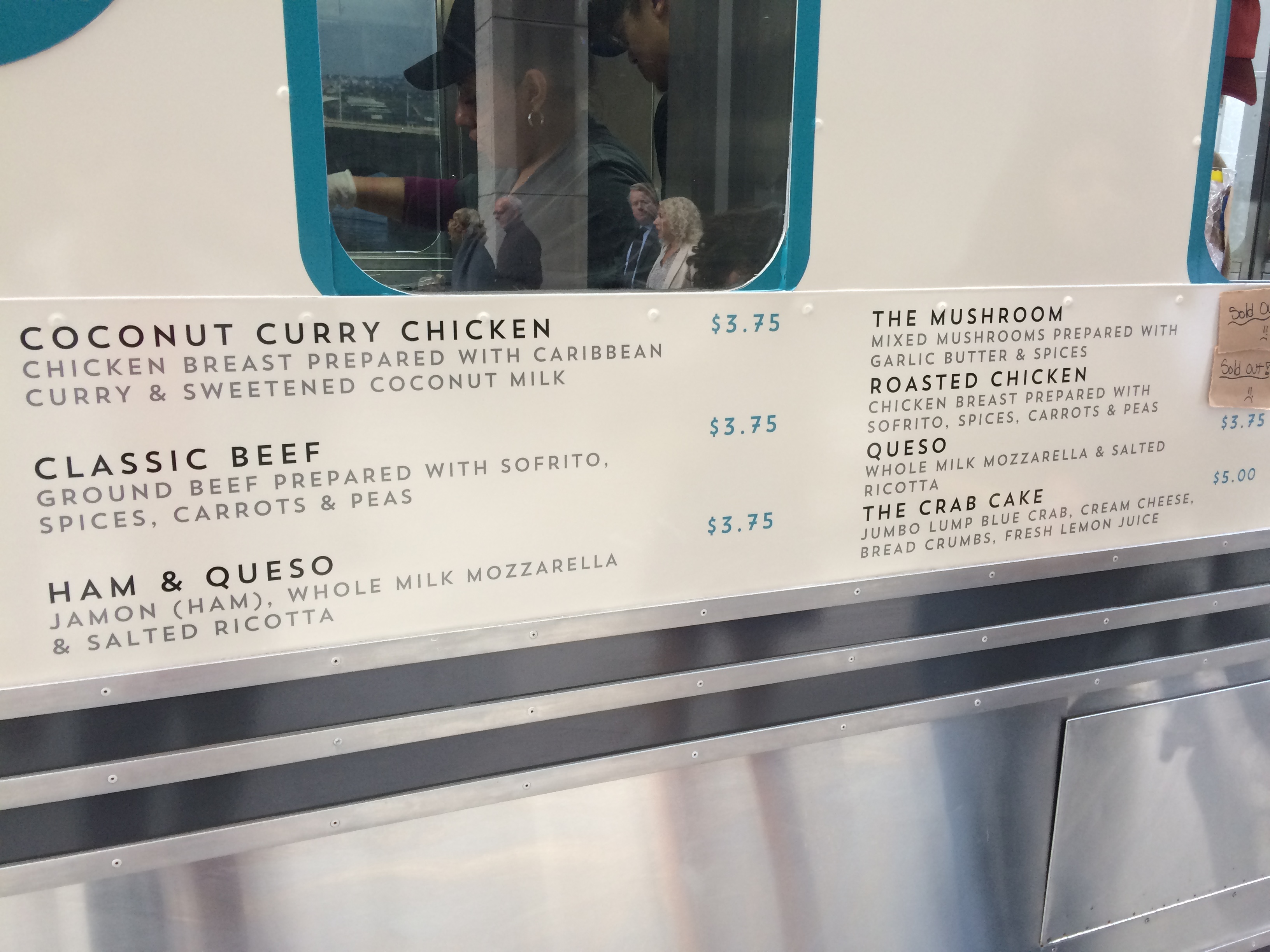 I had already eaten lunch, so wasn’t looking to fill up, but rather get an idea of what they offer. I thought the coconut curry chicken empanada sounded interesting, so I forked over $3.75 for a snack.