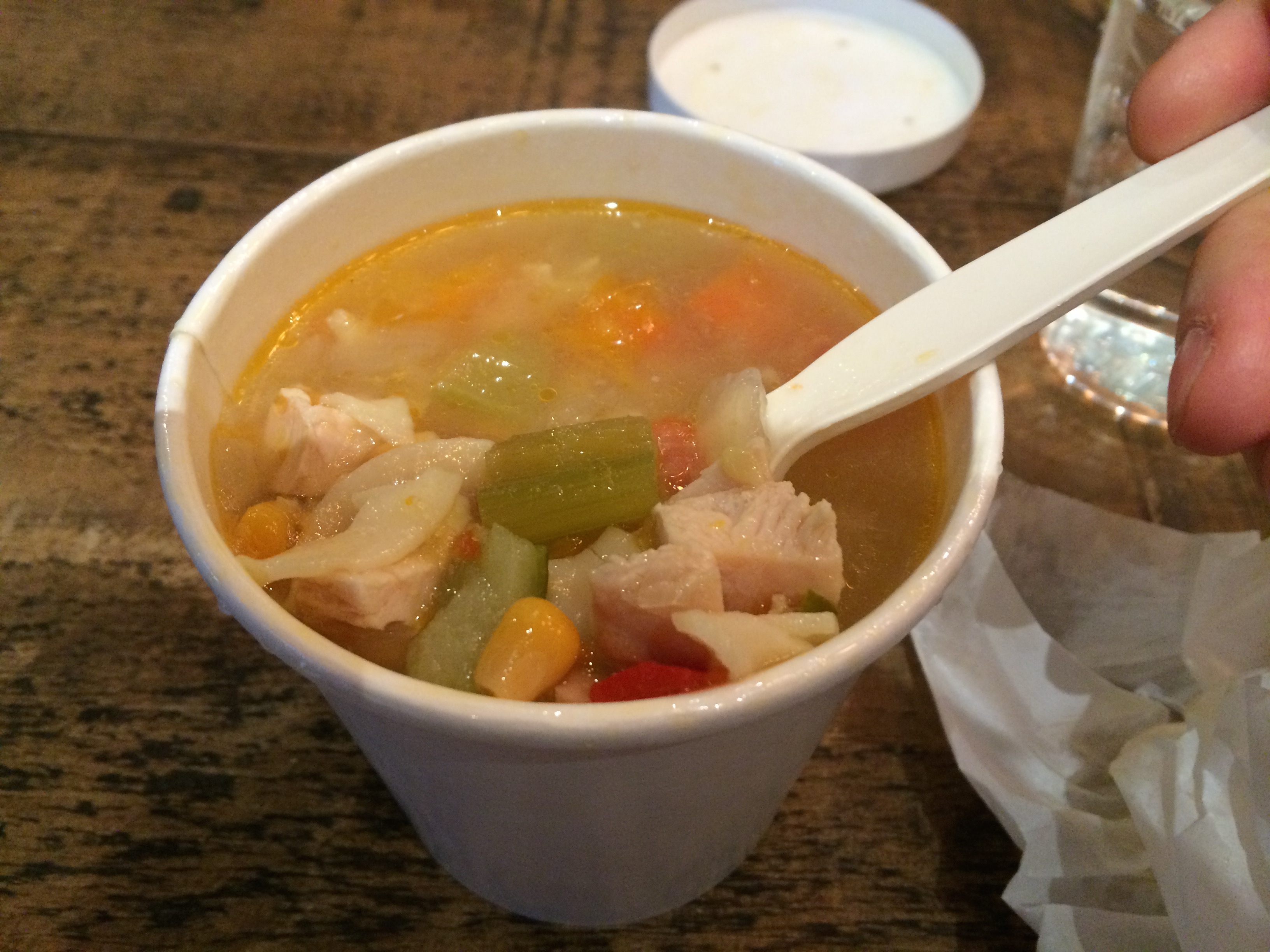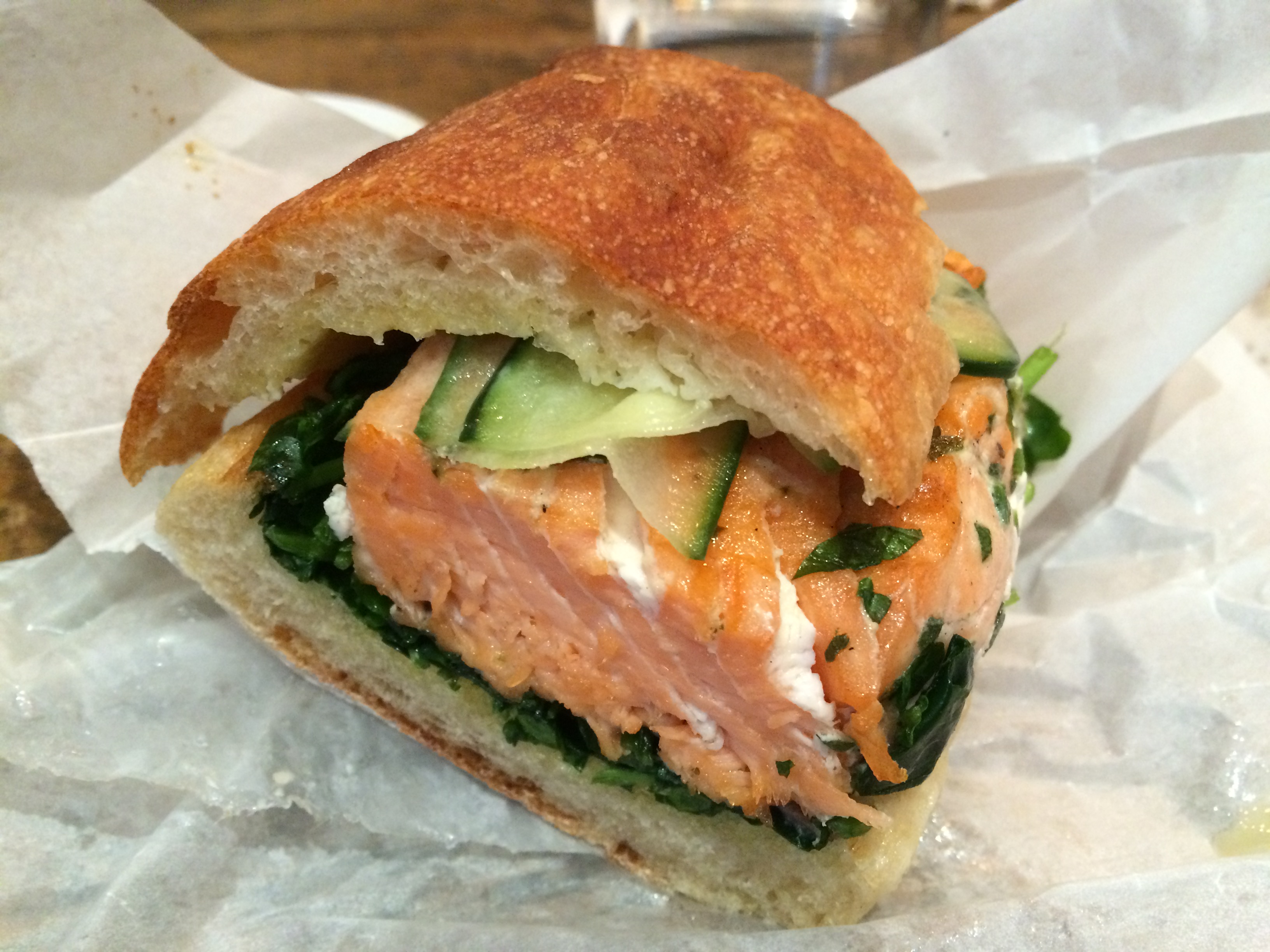 I splurged a bit for the half sandwich and soup combo for $10.50. I was impressed that the half sandwich was still a decent size and had quite a bit of herb grilled salmon between the bread. To be honest, that bread – a chewy ciabatta-esque vessel – was the best part of the sandwich.