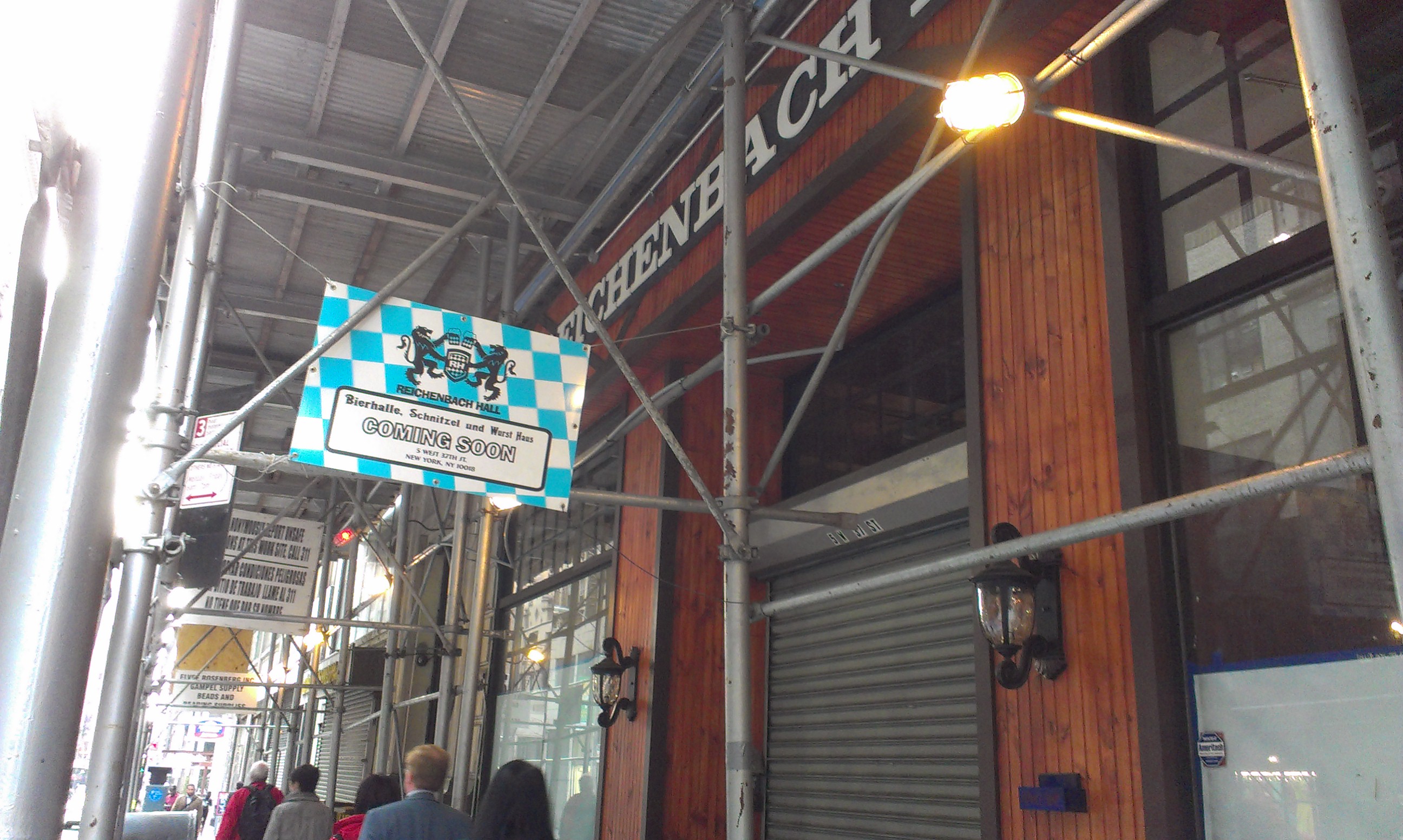 Midtown already has Bierhaus on 3rd Ave., but now Midtown West is set to get some German beer action. Reichenbach Hall is under construction on 37th St. between 5th and 6th Aves. Their signage and website promises beer, schnitzel, and sausage, but there’s no word on when they’ll open their doors. Anyone excited for more German lunch options, or maybe just a place to grab a few liters of lager after work?