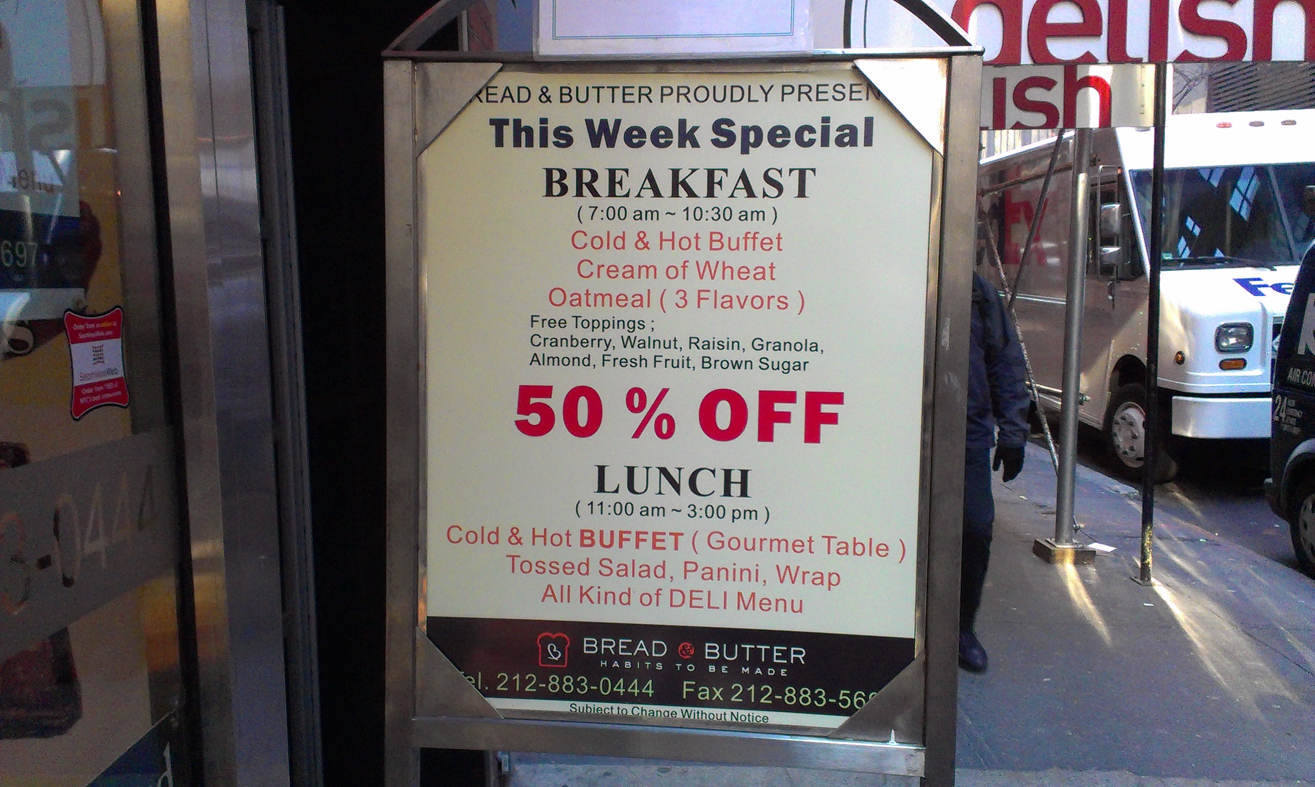 Looking for cheap eats? Of course you are. Well, look no further than Bread & Butter (44th St. btw. Madison+Fifth Ave.), which boasts 50% off both breakfast and lunch this week and next. The breakfast special runs from 7:00-10:30am, while the lunch special is available from 11:00am-3:00pm. Thanks to Lunch’er ‘Justin’ for sharing the news about this deal.
