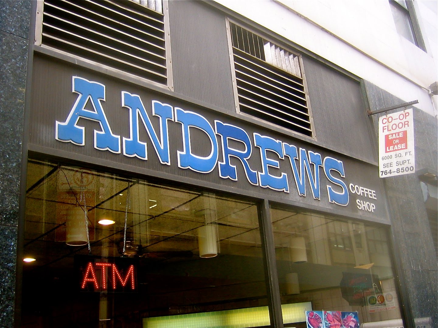 According to Jeremiah’s Vanishing New York, only 2 of the original 15 locations of Andrew’s Coffee Shop are still open, and both are in Midtown. According to the piece (which was inspired by the closing of the last remaining downtown branch of Andrew’s) the one on 35th and 7th is renovated and kind of crowded, while the location on 38th btw. 7+8th is practically empty. In other words, if you’re looking for a bit of quiet lunchtime nostalgia, you might want to check out the branch on 38th before it closes too.