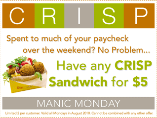 Manic Mondays Mean $5 Sandwiches at Crisp: According to the ML Twitter Tracker today is Manic Monday at Crisp, so every falafel sandwich is just $5 (update: if you print this coupon.) Also Cravings is on 48th, Cupcake Stop is on 52nd, Mexicue and Eddie's are in the Flatiron, Quick Stop Kosher is on 33rd, Rickshaw and Street Sweets are on 46th, Joyride is on 52nd, and Cer Te has extended the Uncle Sammie through the end of the week.