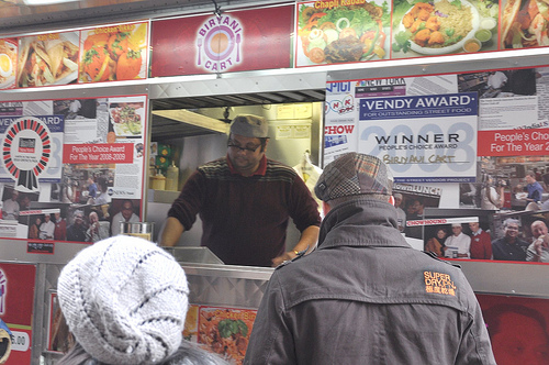 Meru has moved his second Biryani Cart downtown to Greenwich Street, where Kwik Delights and El Rey del Sabor are also currently vending. The menu down there is the same. If only Andrea still worked downtown, there’d be lots of news to report.