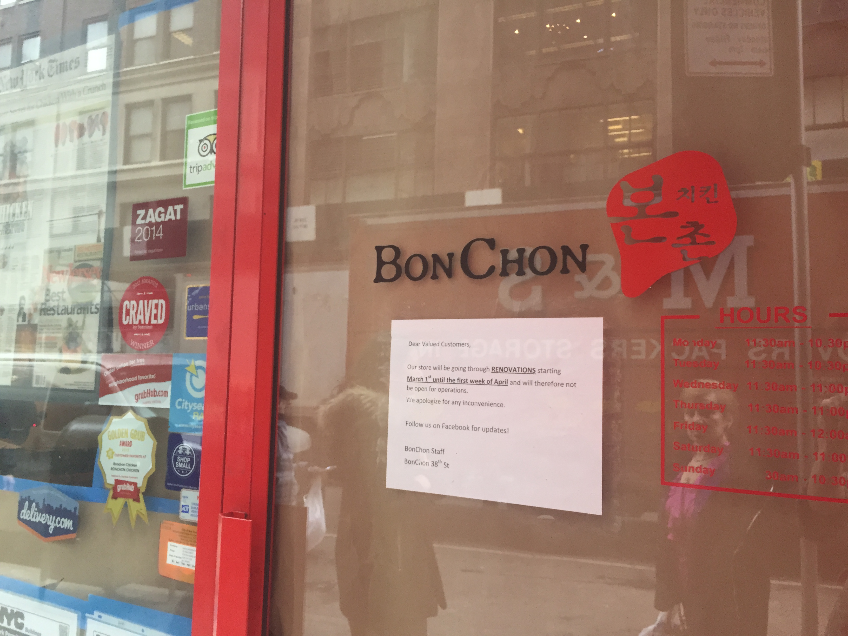 The month-long closure notice was already on the door at the end of February when my coworker and I went to get our favorite KFC (Korean Fried Chicken), and yet it didn’t register until I was confronted by the paper covered windows and locked doors on 38th btw. 7+8th. Looks like we will be schlepping to the 5th Avenue Koreatown location if someone wants their Bonchon. Popeye’s and NYC Fried Chicken just aren’t quite the same.
