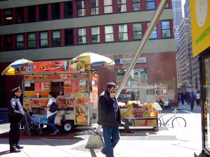 UPDATE: The cart parks on 47th btw. 6+7th every day but Wednesdays. On Wednesday it has been parking on 49th btw. 6+7th.