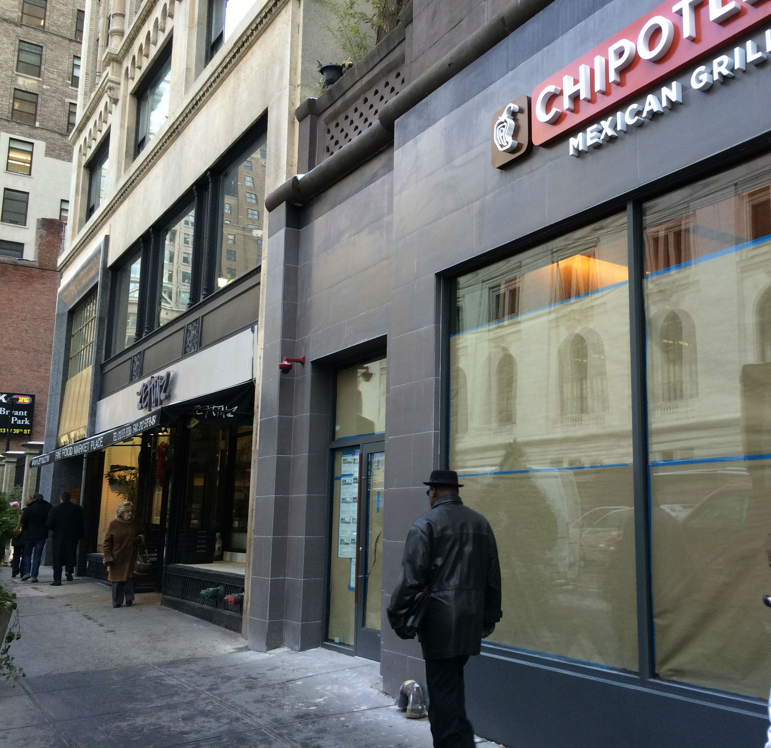 Yes, you’ve read that correctly. A new Chipotle Mexican Grill is coming to 40th between 5th and 6th Avenue, right next door to Zeytinz. For those of you keeping track, this new location is almost directly across from the Chipotle on 42nd. If you’ve ever found yourself arriving at the Chipotle on 42nd, only to be greeted to a line stretching out the door, you will soon be able to zip across Bryant Park to the new location where you will probably be greeted with a similarly long line. Nonetheless, it should be open shortly. As you can see from the image, they appear to be making things happen rather quickly.