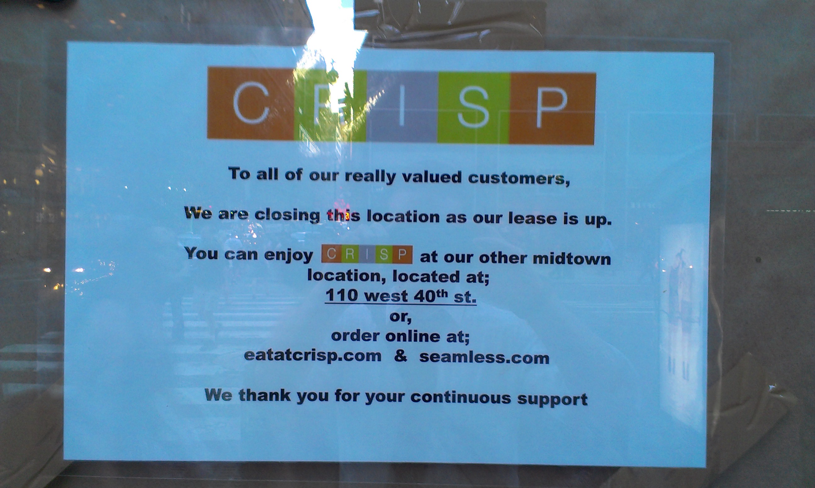 Earlier this month, we reported that Crisp‘s 3rd Ave. location closed after their lease ran out. We were sad to see them go, but before it can really set in, Crisp Express opened this week on 43rd St. (btw 3rd+Lex), where Simply Sliders used to be. Their menu looks smaller than before (it is ‘Express’ after all), offering a few different falafel sandwiches, hummus, and salads. So we’ve got out gourmet falafel back in Midtown East, but we’ve lost our sliders. Are you happy with the trade?
