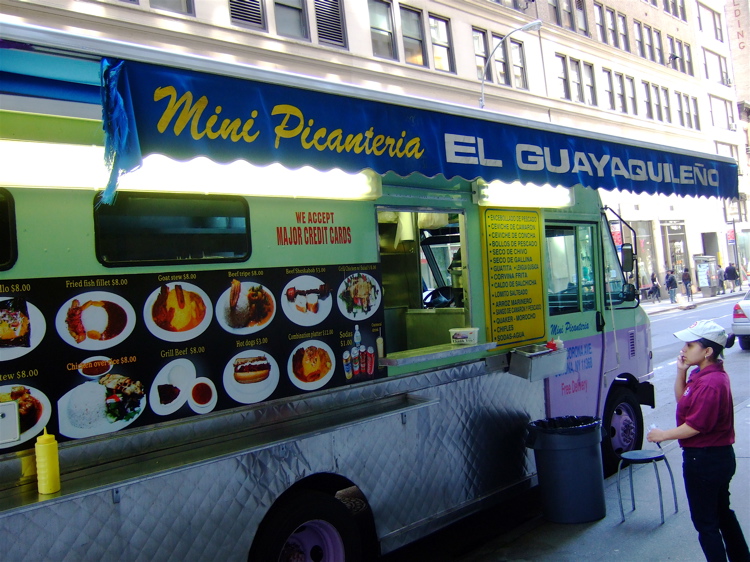 Ecuadorian food options are few and far between in Midtown. The only places I’ve heard of are El Rincon de Sabor (on 47th btw. 5+6th) and the lady selling Ecuadorian food from a shopping cart that Zach wrote about a couple years ago. Neither are particularly accessible to me in the Midtown South area, so when Luncher “@stenrotweeted the other day that El Guayaquileño, a new Ecuadorian food truck had popped up on 37th and 7th, I broke out into a jog to go check it out.