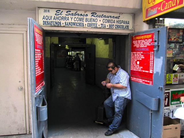 When I first began working in Midtown, one of the reasons I was intrigued by our beloved Midtown Lunch blog was the deliberate coverage of “hidden gems” that are often found in freight elevator hallways or on second floors of buildings. The unexpected restaurant locations reminded me of Chungking Mansions, one of the cheapest places to find an apartment in Hong Kong, and a building peppered with retail shops and Indian restaurants inhabiting the space meant for an apartment flat. This was one of my favorite places to eat when I did a brief stint partying studying in Hong Kong. MJP did a great post on Nick’s Place earlier this summer, which happens to be the only freight-elevator-hall restaurant I was lucky enough to stumble upon a few months ago. The rest of the places are so hidden, I can only find them by using Midtown Lunch as a reference. El Sabroso, an Ecuadorian restaurant tucked in the hall next to the freight elevators of a building in the fashion district, is as traditional and just about as lowbrow as you can get.