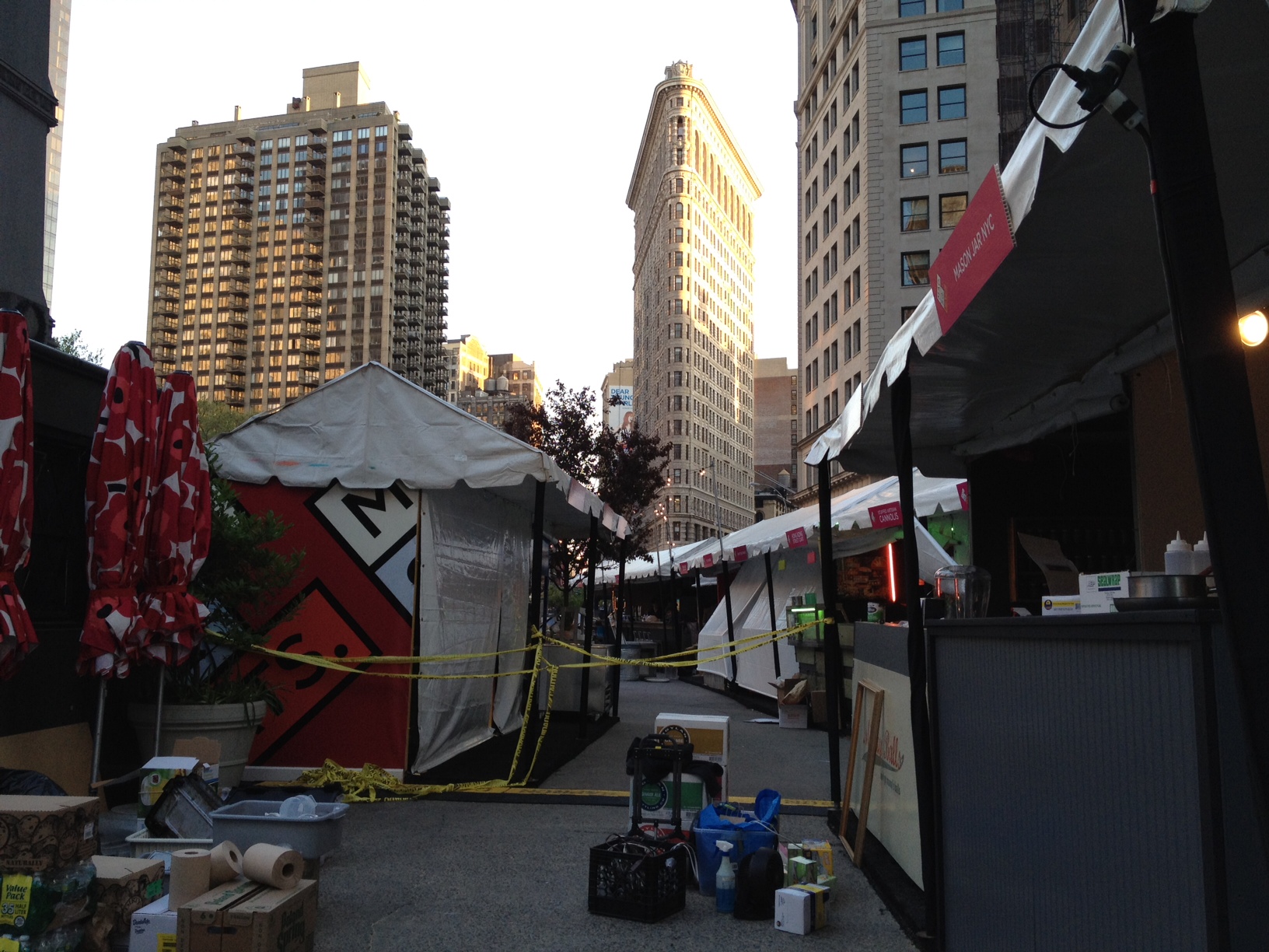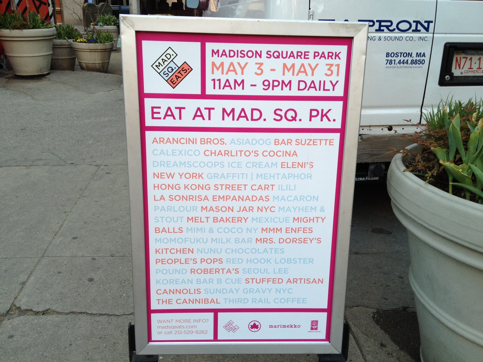Happy First Day of Mad. Sq. Eats Spring 2013! Starting today, the yellow tape in the above photo will come down, the vendors will roll up their tent panels, and we will all descend on Worth Square at the corner of 5th Avenue and Broadway from 24th to 25th. If you need a reminder of how this went down in the past, please visit these hunger-inducing posts: here, here, and here.