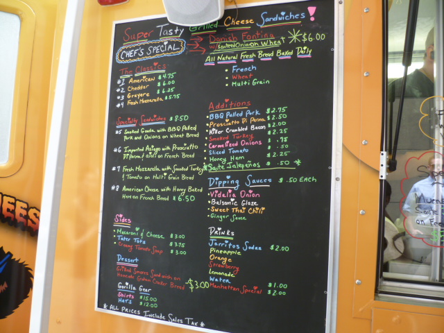 Gorilla Cheese is the first of the triumvirate of grilled cheese trucks slated to hit the city this summer. They launched a few weeks ago, but made their first foray into Midtown last Thursday. The line was rather modest when I arrived around 1:00 and it took me only 10 minutes to order and receive my sandwich. That’s quite a turnaround from what Andrea experienced downtown the previous week. Either these guys have finally got their act together or the novelty of buying grilled cheese from a truck has quickly worn off.