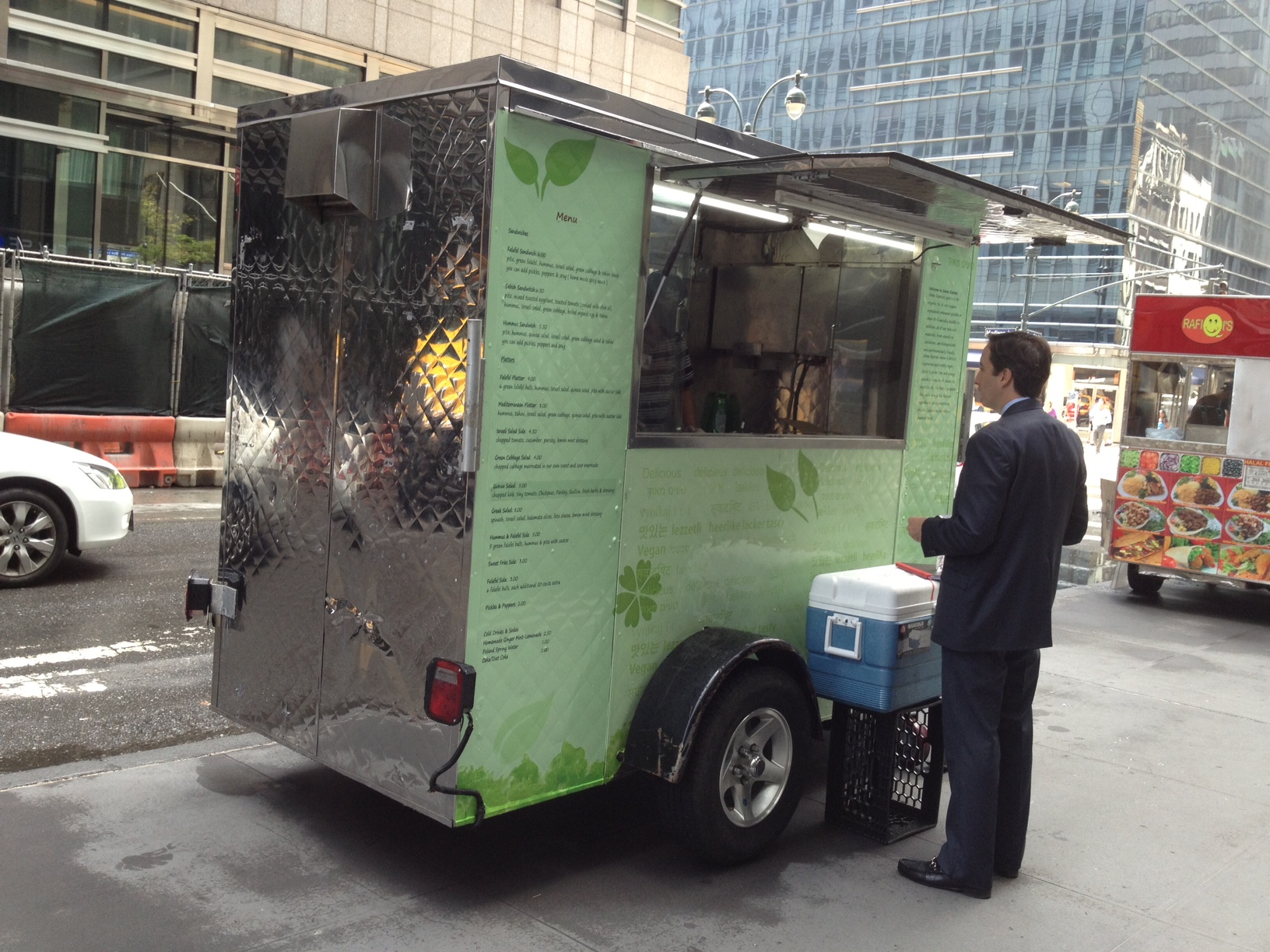 After frequenting the food truck haven at 47th Street and Vanderbilt, I’ve noticed that the lineup of trucks and carts varies from day to day. It’s become a popular spot for new vendors to set up shop, including the likes of Rhong Tiam, Bread and Olives, and the not-yet-reviewed Monkey Brothers Lab. Yesterday, I noticed ANOTHER new cart on the block, Green Express. They’ve got a limited menu of vegetarian Middle Eastern food, like falafel, hummus, and sabish (toasted or fried eggplant). The cart prides itself on offering mostly organic, mostly vegan food in environmental friendly, biodegradable containers. I can see where the “green” in their name comes from…