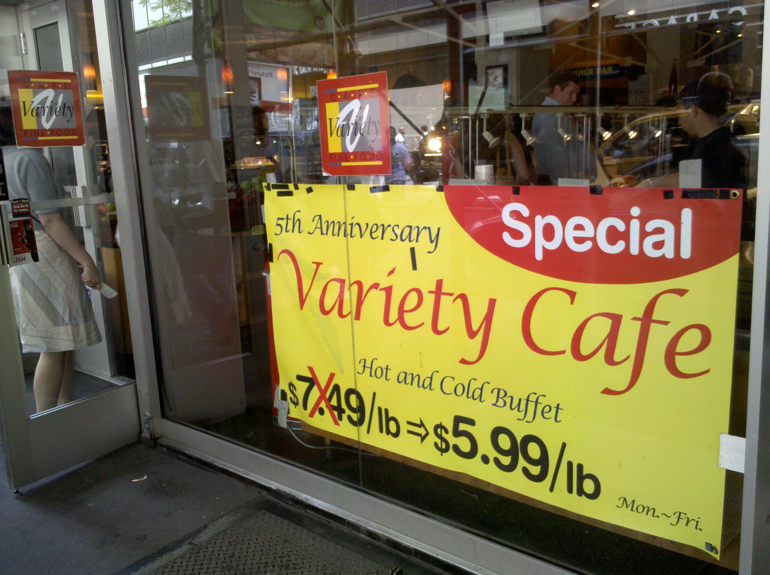 I’m not sure if any Midtown Lunch’ers still eat at Variety Cafe, the big generic deli on 48th (btw. 5th and 6th), considering its rather odious presence on this site over the years. On my way to lunch yesterday, however, I noticed that they are celebrating their 5th Anniversary by slashing the price on their hot and cold buffet from $7.49/lb to $5.99/lb (Monday-Friday). Unfortunately, it doesn’t apply to their “salad bar for fat people,” and you know, there’s the whole DOH thing to worry about. I stopped in just to see what they had to offer, and besides the usual stuff all these delis have, there were some shrimp stuffed mushrooms. Proceed, if you must, but do so with caution.