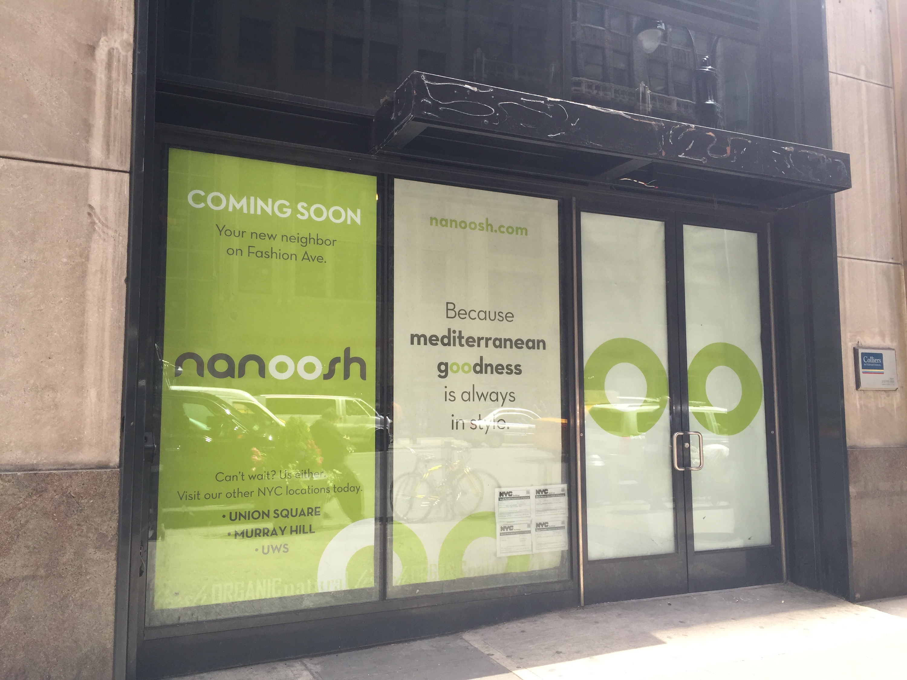 Oh, hello. A new poster-plastered storefront spotted in the heart of Garment District! There’s already a Nanoosh all the way on Madison, but not on the west side. Then again, not sure if the hood really needs yet another hummus-centric menu. The Hummus and Pita Company (on 8th btw. 39+40th) is currently my favorite, though there’s plenty of other mediocre choices. No opening date just yet, but if we’re lucky enough, they’ll do another free giveaway? If you’ve been to their other locations, let us know how you feel about a new branch in Midtown West.