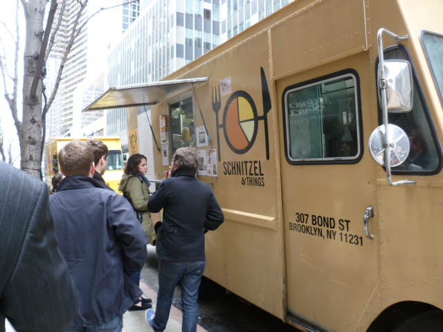 It’s been mentioned on Midtown Lunch in the past and I’ve seen it on the truck as a regularly featured special, so I figured I should forego my usual veal and give the eggplant schnitzel a try. And while I know Oleg Voss and his crew do a fantastic job with all the vegetable side dishes, like roasted beets with feta and cucumber salad, I was a bit less confident when it comes to frying up a piece of eggplant. I had visions of greasy and mushy aubergine segments.