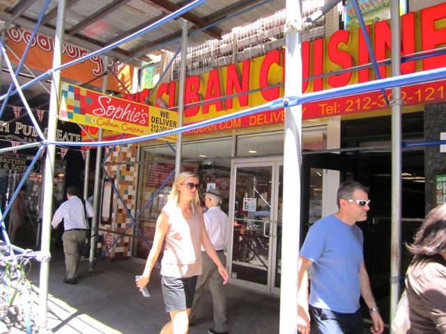So I’ve been jonesin’ for some tamales, no lie. They’re cheap, tasty, and very filling–think 6 bucks to feel like you have big ol’ corn brick in your belly. But I hadn’t seen many places around midtown. But one day I looked through the window of Sophie’s Cuban Cuisine (the one between 45th St btw 5th + 6th) and I noticed they had some corn husk wrapped tamales for sale! So I grabbed a few of what I now know is a Cuban-style tamale.
