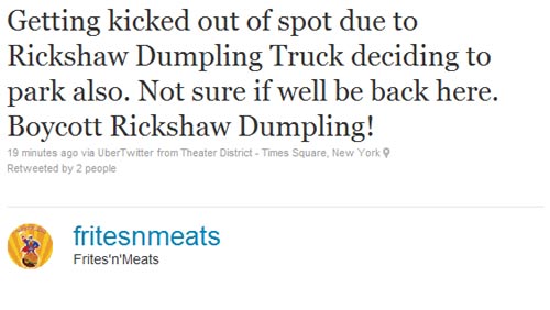 Last Tuesday the cops permanently banned food trucks from in front of the Fox News Building after the Rickshaw Dumpling Truck parked alongside the Frites N Meats Truck on 48th btw. 6+7th. And it looks like 52nd Street might be next… yesterday the Frites N Meats truck were kicked out of their spot on 52nd and 6th by the very same cops- and told