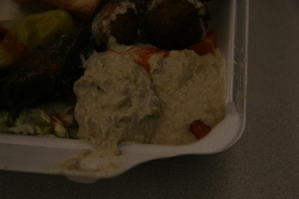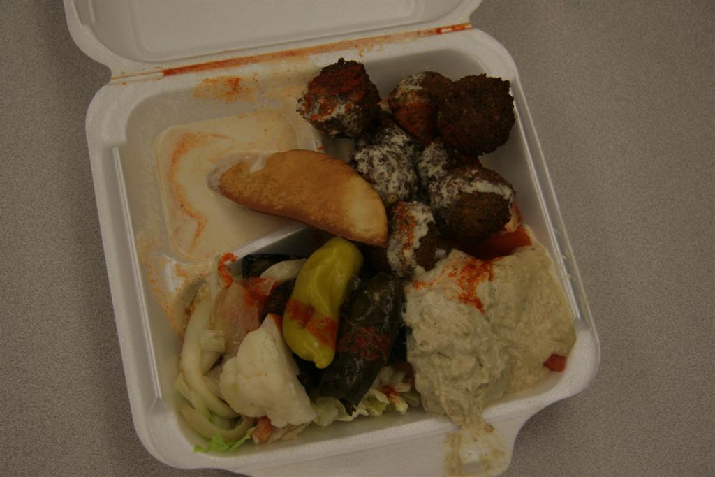 Clockwise from top right, that’s falafel, hummus, baba ghannouj, a grape leaf, a pepperoncini, fried eggplant (under the grape leaf and pepper), salad (all under the bottom part of the box), tahini, and a piece of fried pita. And of course, there’s hot sauce on the whole lot of it.